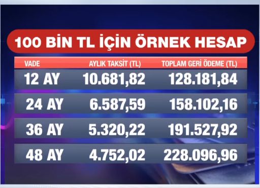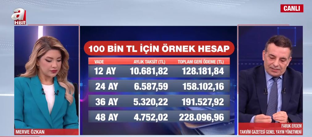 Programda 100 bin TL'lik bir borç üzerinden hazırlanan ödeme tablosunu yorumlayan Faruk Erdem, vatandaşlara imkanlar dahilinde kısa vadeyi tercih etmelerini önererek, "12 aylık bir vadede aylık taksit 10 bin 681 lira olurken toplam ödeme 128 bin lira seviyesinde kalıyor. Ancak vade 48 aya yayıldığında taksit 4 bin 752 liraya düşse de geri ödeme miktarı iki katından fazla artarak 228 bin liraya çıkıyor. İmkanları biraz zorlayıp borçtan bir yılda kurtulmak en mantıklısı, çünkü vade uzadıkça maliyet katlanıyor" açıklamasında bulundu.