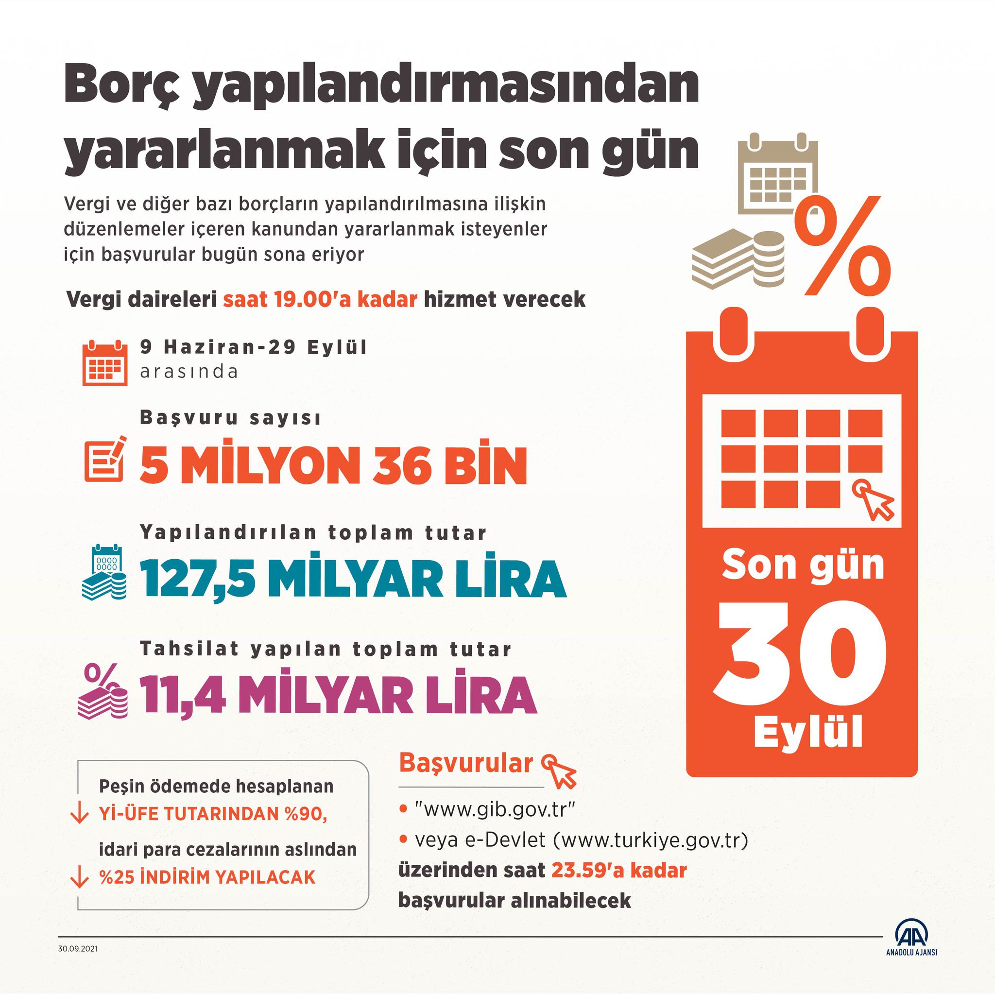 Vergi borcu yapılandırma için başvurular bugün sona erecek. Başvurularını vergi daireleri üzerinden gerçekleştirmek isteyen vatandaşarın saat 19.00'a kadar vergi dairelerine gitmeleri gerekiyor. Online başvuru yapacak olanlar için ise başvuru süreci 23.59'a kadar sürecek.