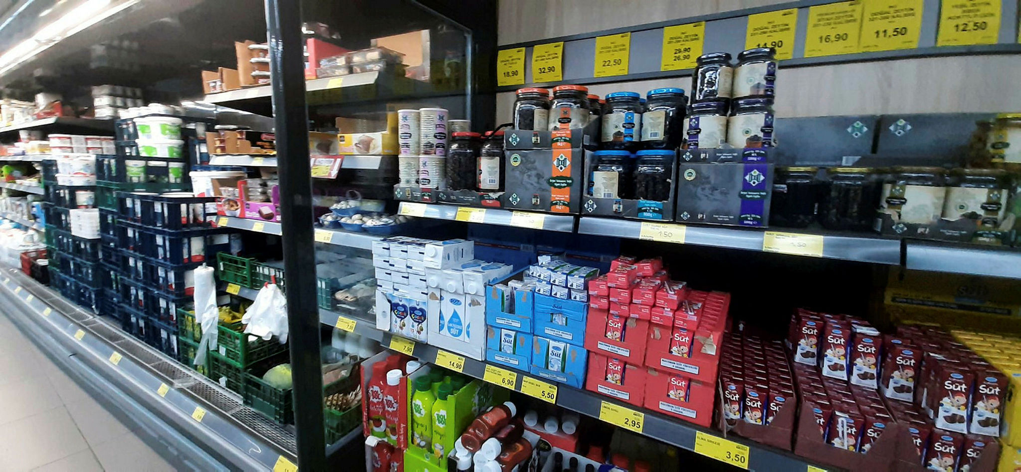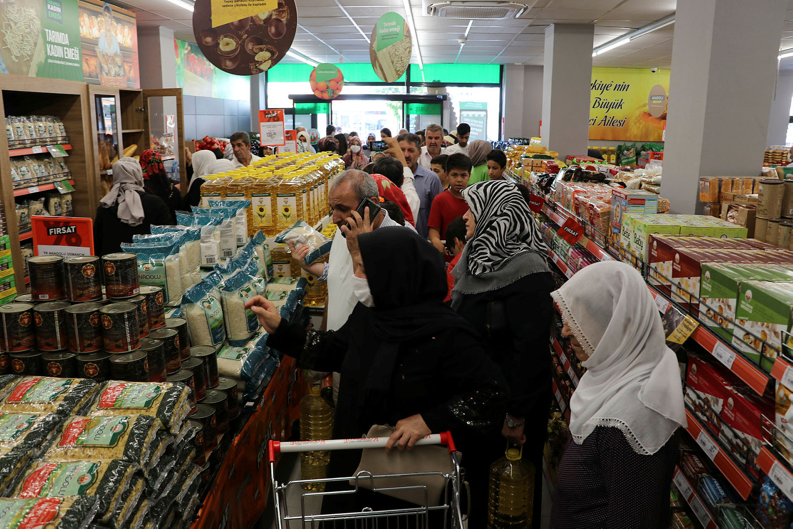 "Makarna, un, salça, pirinç, bulgur, mercimek, nohut, fasulye, şeker, ay çiçek yağı, zeytin yağı, tavuk ürünleri, tam yağlı süt, yarım yağlı süt, yumurta, peynir, tereyağı, bal, zeytin, çay, Türk kahvesi, patates, kuru soğan, karpuz, kavun, çamaşır deterjanı, bulaşık deterjanı, çamaşır suyu, sıvı sabun, peçete, rulo havlu, kolonya, bebek bezi"