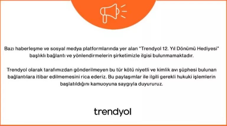 "Bazı haberleşme ve sosyal medya platformlarında yer alan "Trendyol 12. Yıl Dönümü Hediyesi" başlıklı bağlantı ve yönlendirmelerin şirketimizle ilgisi bulunmamaktadır. Trendyol olarak tarafımızdan gönderilmeyen bu tür kötü niyetli ve kimlik avı şüphesi bulunan bağlantılara itibar edilmemesini rica ederiz. Bu paylaşımlar ile ilgili gerekli hukuki işlemlerin başlatıldığını kamuoyuna saygıyla duyururuz."