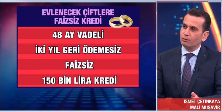Kuşkusuz en heyecanlandıran müjde de yeni evlenecek gençlere yönelikti. Çiftlere 2 yıl geri ödemesiz, 48 ay vadeli 150 bin TL faizsiz kredi verileceğini açıkladı Başkan Erdoğan. Uygulama 81 ilde başladı.