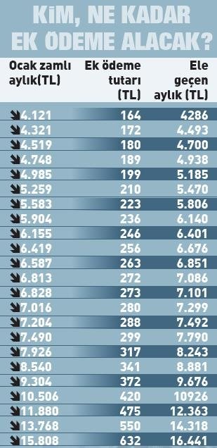 Örneğin, geçen yıl Temmuz ayında 3147 lira alan Ahmet Bey'in aylığı Ocak zammıyla birlikte 974 lira artarak 4121 liraya çıktı. Bu yıl için 164 liraya çıkan ek ödemeyle Ahmet Bey'in hesabına 4186 lira yatacak.