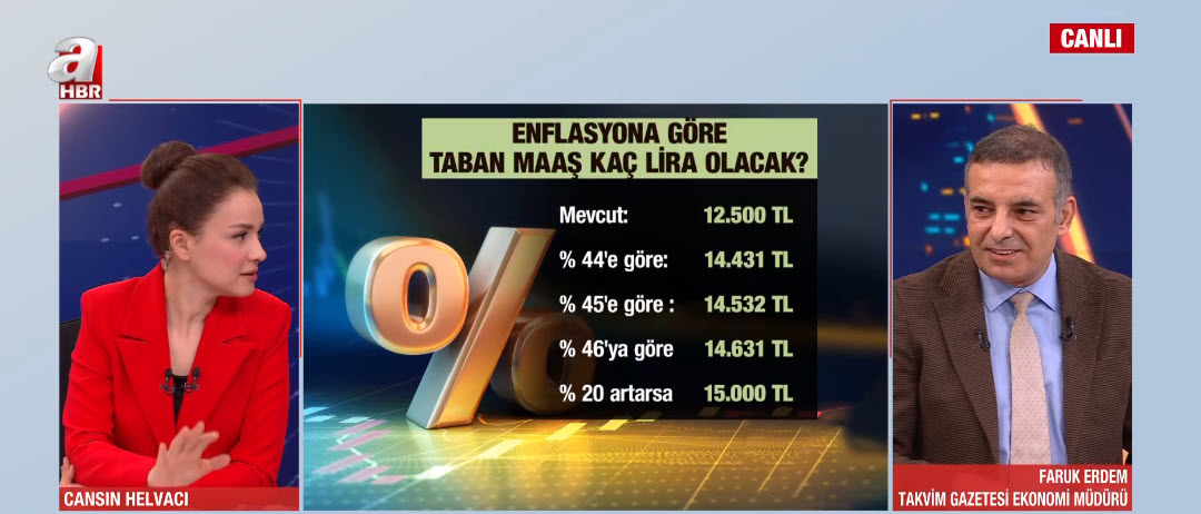 Takvim Gazetesi Ekonomi Müdürü Faruk Erdem, A Haber canlı yayınında en düşük emekli maaşı için rakam verdi.