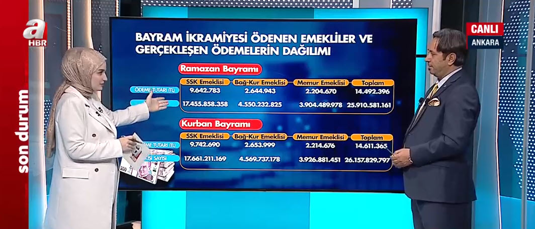 Öncelikle emekli ikramiyesinden başlayalım. Geçen yıl kaç kişiye ne kadar ikramiye ödendi? Geçen yıl 2 bin TL'ydi ikramiye. Yüzde 50 zamlandı 3 bin TL'yi buldu.
