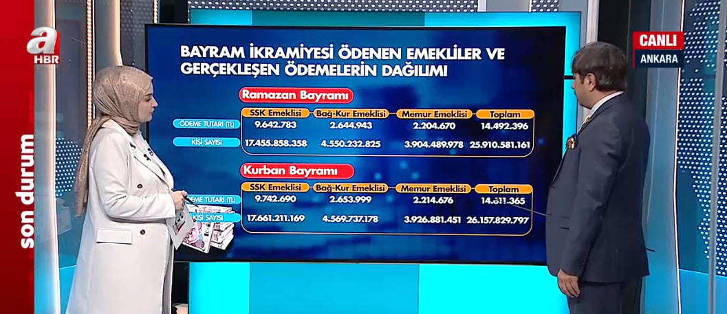 Emeklilere yapılacak iyileştirmeler seçim sonrasında Meclis'in ilk gündem maddesi olacak. Masada hangi formüller konuşuluyor? Çalışan ve emeklilere ne düzenleme yapılacak? A Haber muhabiri Filiz Uçan Savaş, Sosyal Güvenlik Başuzmanı İsa Karakaş'a sordu. Not: "Bayram ikramiyesi ödenen emekliler ve gerçekleşen ödemelerin dağılımı" grafiğinde "Ödeme tutarı (TL)" ve "Kişi sayısı"nın yerleri yanlış yazılmıştır.