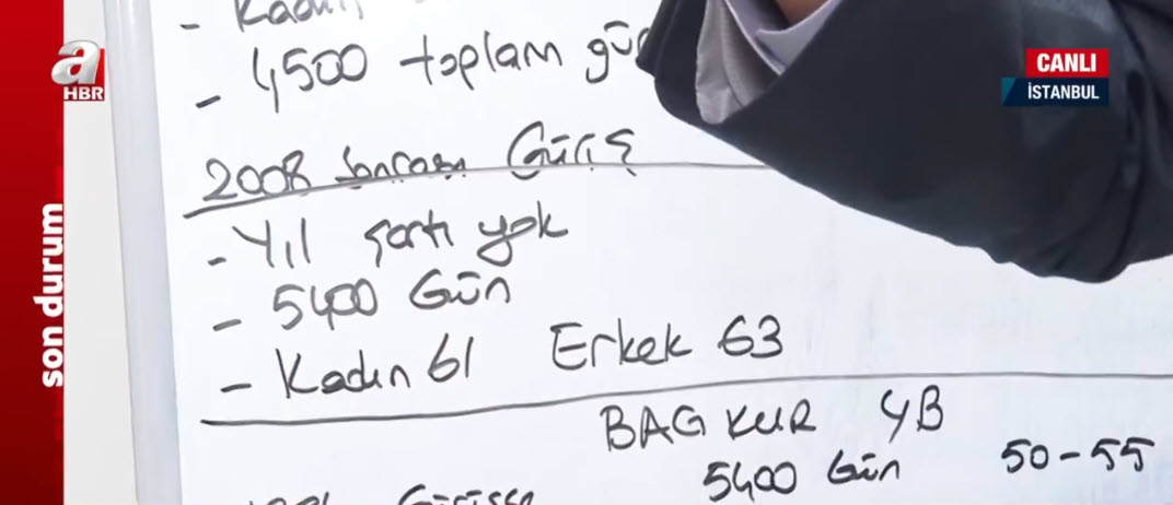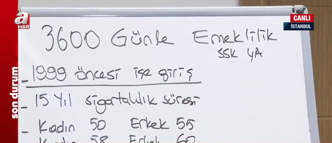 Ama açıklığa kavuşturulmayan hiç dillendirilmeyen bir de 3600 meselesi var. Yani eskiden bizim 3600 günle emeklilik yani kısmi emeklilik dediğimiz bir şartımız vardı. Şimdi burada 99 öncesinde işe girişiniz varsa 15 yıl sigortalılık süresi şu anki durumda kadınlarda 58 erkeklerde 60.