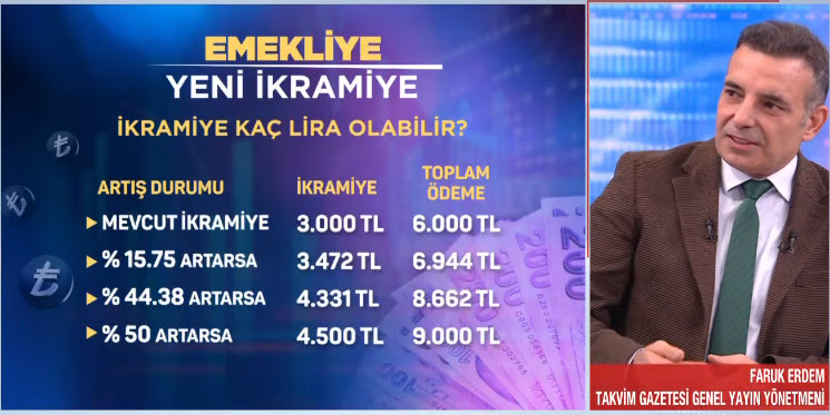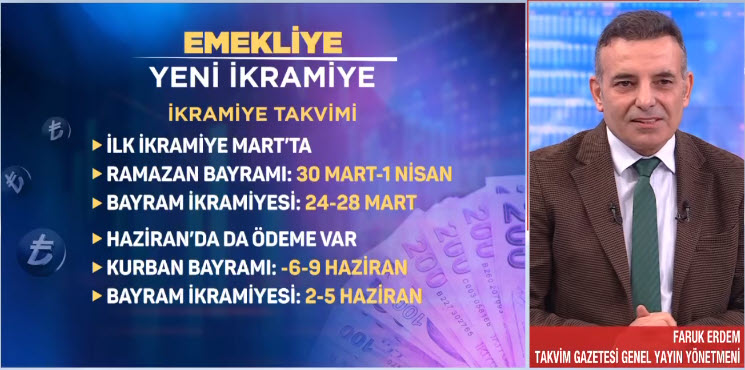 Emekli maaşlarına yapılan artışın ardından gözler bayram ikramiyesinde çevrildi. Milyonlarca emekli bayram ikramiyesine yapılacak artışı bekliyor. Takvim Gazetesi Genel Yayın Yönetmeni Faruk Erdem, A Haber canlı yayınında detayları anlattı. İşte kulislerde konuşulan rakamlar ve ikramiye takvimi...