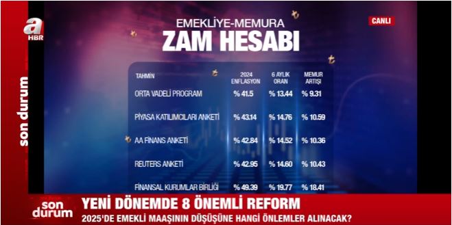SSK ve Bağ-Kur emeklileri için altı aylık enflasyon oranı yüzde 13.44 olarak hesaplanırken, memur emeklileri için toplu sözleşme artışı ve enflasyon farkı ile birlikte bu oran yüzde 9.31'i buluyor. Orta Vadeli Program'daki yüzde 41.5'lik yıl sonu enflasyon beklentisi ise yeni zam oranlarına ışık tutuyor.