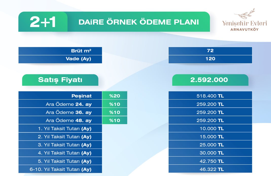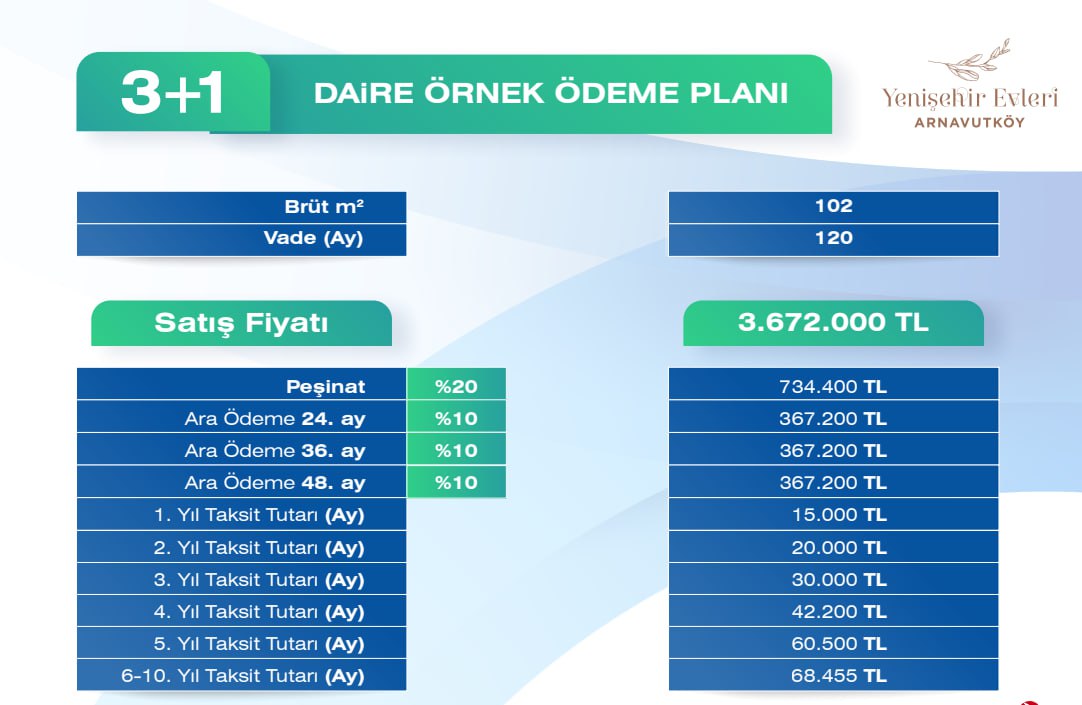 Projede az katlı ve yatay mimari anlayışıyla tasarlanan 1+1, 2+1 ve 3+1 gibi daire tipleri yer alacak. Katılım şartlarını sağlayan başvuru sahipleri, gerçekleştirilecek kura çekimi ile hak sahibi oldukları projeden, yüzde 20 peşinat, 120 ay vade ve 7.500 TL'den başlayan taksitlerle ev sahibi olabilecek. Ödemeler Emlak Konut ödeme sistemiyle Emlak Konut'a gerçekleştirilecek.