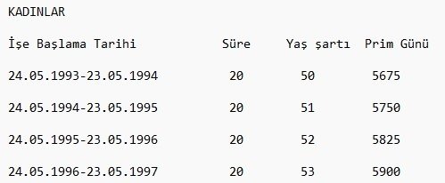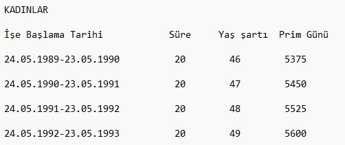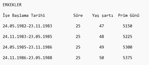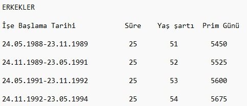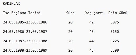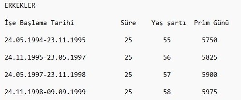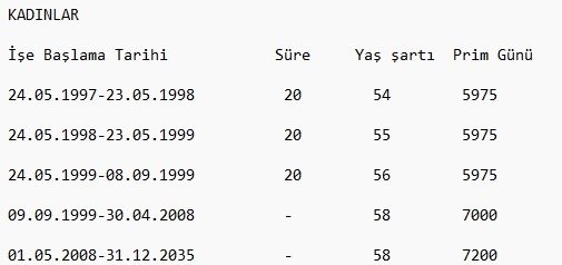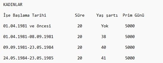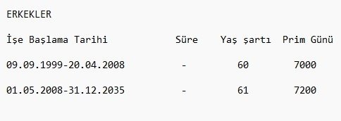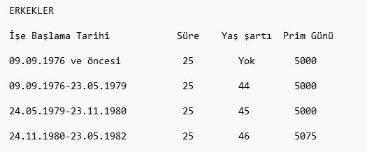 Takvim Gazetesi Ekonomi Müdürü Faruk Erdem'in haberine göre, 8 Eylül 1999 yasası ile birlikte erkekler için işe giriş tarihine göre 44 ile 58 yaş arasında sınır getirildi. Kadınlar da ise bu sınırlar işe giriş tarihine göre 40'dan başlayıp 55'e kadar gidiyor. Dolayısıyla şu anda EYT'li olarak 8 Eylül 1999 öncesinde sigortalı olanlar için işe giriş tarihine göre bu yaşlarda emekli olma imkanı bulunuyor.