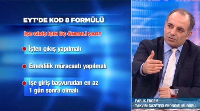 Milyonlarca vatandaş emeklilik için sosyal güvenlik merkezlerine akın ederken, internetten de rekor başvuru geldi. EYT için bir günde 300 bin başvuru olurken, SGK mesai başlangıcını 06.00'ya çekti. Mart ayında başvuranlar 1 Nisan itibarıyla aylığa hak kazanırken ödemeleri yetişmeyenlere topluca ödeme yapılabileceği gibi avans seçeneği de sunulabilecek. Takvim Gazetesi Ekonomi Müdürü Faruk Erdem, EYT ile ilgili detayları A Haber canlı yayınında anlattı.