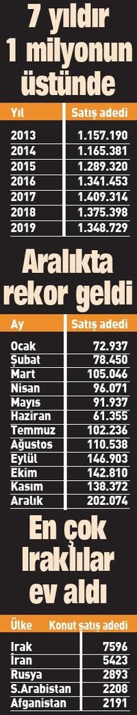 Türkiye İstatistik Kurumu (TÜİK) verilerine göre, yıl boyunca 1 milyon 348 bin 729 ev satıldı. Hükümetin 2018'e başlattığı ve 31 Aralık'ta sona eren KDV ve tapu harcı indirimi de konut satışlarında aralık ayını tüm zamanların şampiyonu yaptı. Ülke genelinde geçen ay 202 bin 74 konut satılarak tüm zamanların aylık rekoru kırıldı.