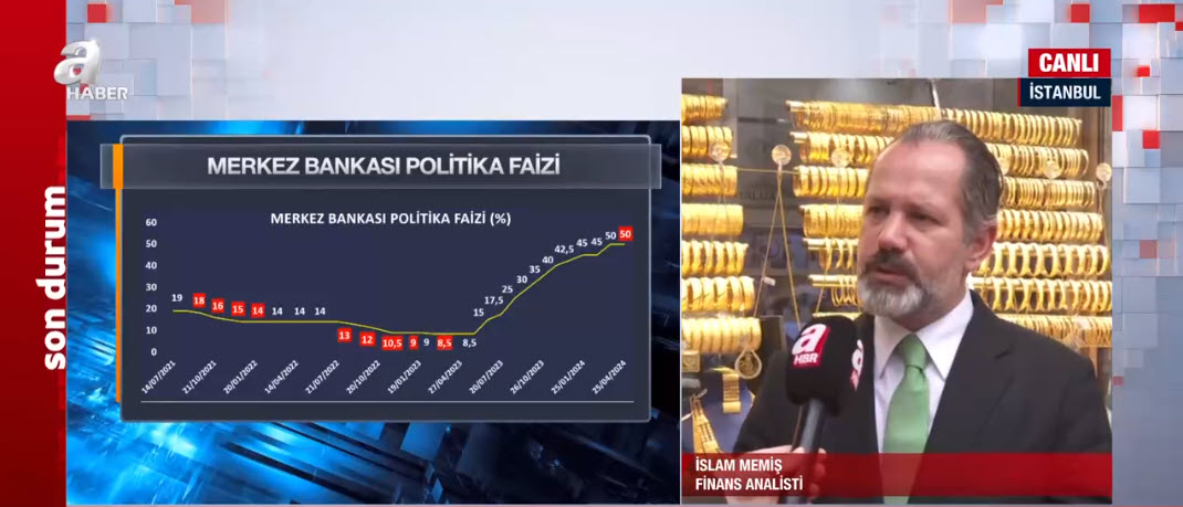 Merkez Bankası piyasa beklentisi doğrultusunda politika faizini yüzde 50 seviyesinde sabit bıraktı. Peki MB ne mesaj verdi? Kararının ardından piyasalarda son durum ne? Altında seyir ne olur? Yükselir mi düşer mi? A Haber muhabiri Tülay Ayçiçek Tosun, Finans Analisti İslam Memiş'e sordu. Memiş, gram altın için tahminini açıkladı ve alım fırsatı için rakam vedi.