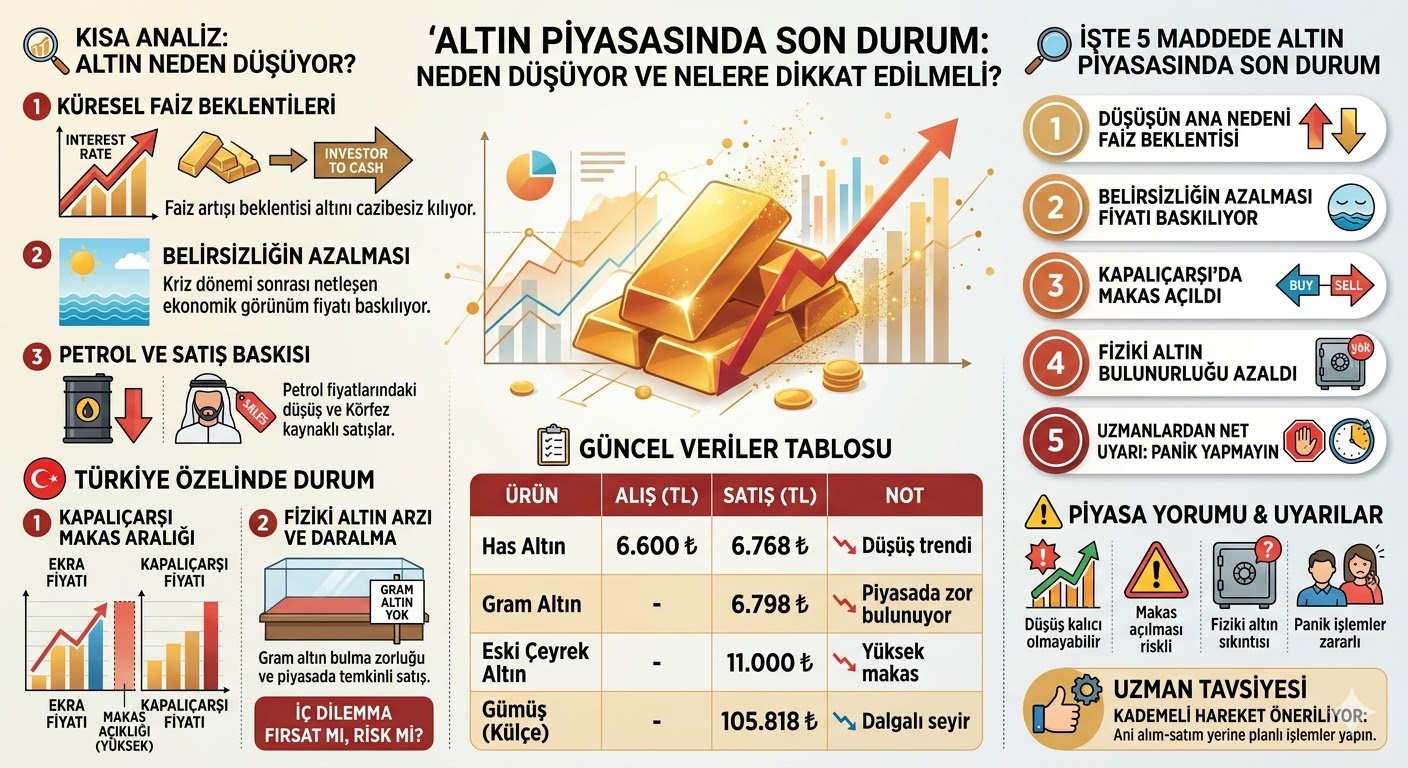 Altın piyasasında sert dalgalanma sürerken Kapalıçarşı'da fiyatlar gün içinde hızla değişiyor. Gram ve çeyrek altında düşüş dikkat çekerken kuyumcularda ürün bulunurluğu ve makas aralığı tartışma konusu oldu. Uzmanlar, düşüşte faiz beklentileri ve jeopolitik gelişmelerin etkili olduğunu belirtirken yatırımcıya "panik yapmayın" uyarısı yaptı.