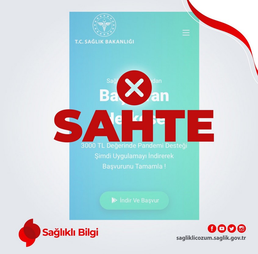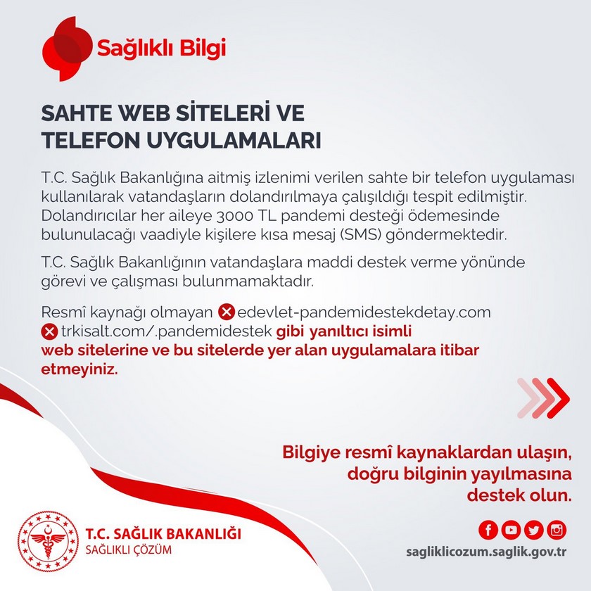 T.C. Sağlık Bakanlığına aitmiş izlenimi verilen sahte bir telefon uygulaması kullanılarak vatandaşların dolandırılmaya çalışıldığı tespit edilmiştir. Dolandırıcılar her aileye 3 bin lira pandemi desteği ödemesinde bulunulacağı vaadiyle kişilere kısa mesaj göndermektedir. T.C. Sağlık Bakanlığının vatandaşlara maddi destek verme yönünde görevi ve çalışması bulunmamaktadır. Resmi kaynağı olmayan 'edevlet-pandemidestekdetay.com', 'trkisalt.com/pandemidestek' gibi yanıltıcı isimli web sitelerine ve bu sitelerde yer alan uygulamalara itibar etmeyiniz. Bilgiye resmi kaynaklardan ulaşın, doğru bilginin yayılmasına destek olun"