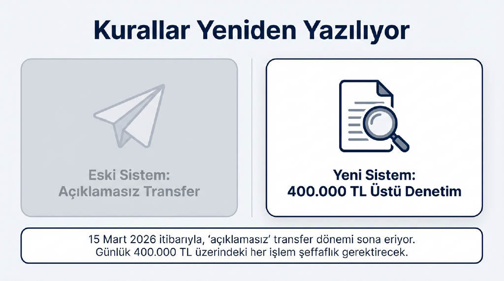 Mali Suçları Araştırma Kurulu (MASAK), para transferlerinde kayıt dışı finans hareketlerini önlemek amacıyla Mart ayında dev bir uygulamayı devreye alacak. 2026 yılı Mart ayında hayata geçecek düzenleme kapsamında, günlük transferlerdeki açıklama zorunluluğu sınırı 400 bin liraya yükseltilecek.