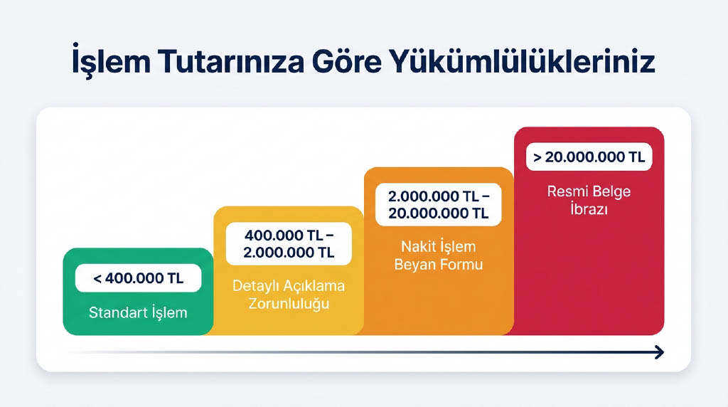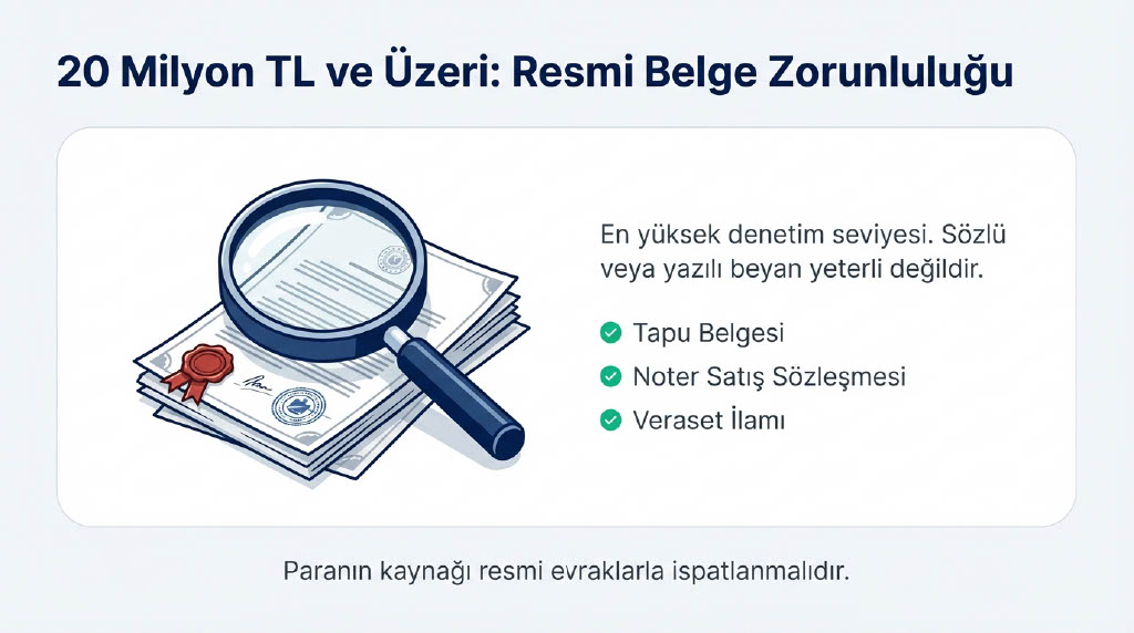- 20 milyon TL üzeri: Paranın kaynağına dair resmi belge sunulması istenecek.