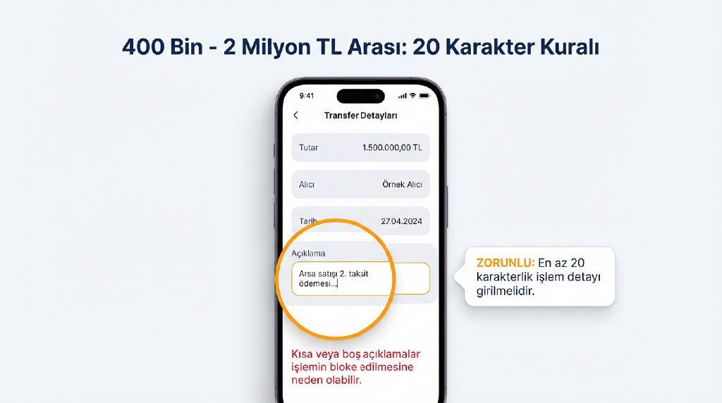 - 400 bin - 2 milyon TL arası: 20 karakterlik açıklama zorunlu.