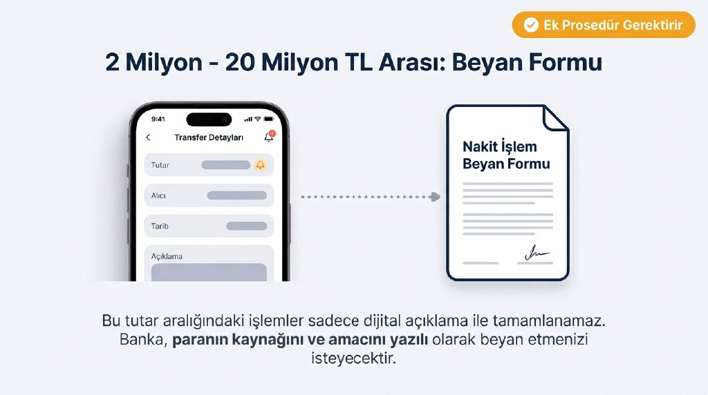 - 2 milyon - 20 milyon TL arası: "Nakit İşlem Beyan Formu" doldurulacak.