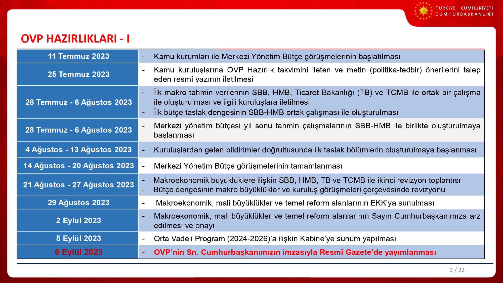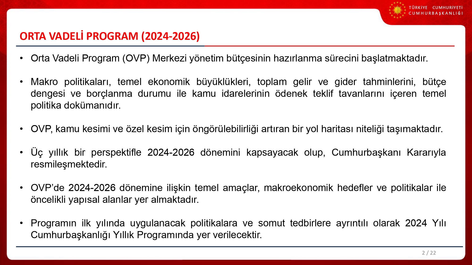 OVP merkezi yönetim bütçesinin hazırlanma sürecini başlatan temel dökümanımızdır. Temel ekonomik büyüklükleri, toplam gelir gider tahminlerini, kamu idarelerinin ödenek teklif tavanını içeren temel politika dökümanıdır.
