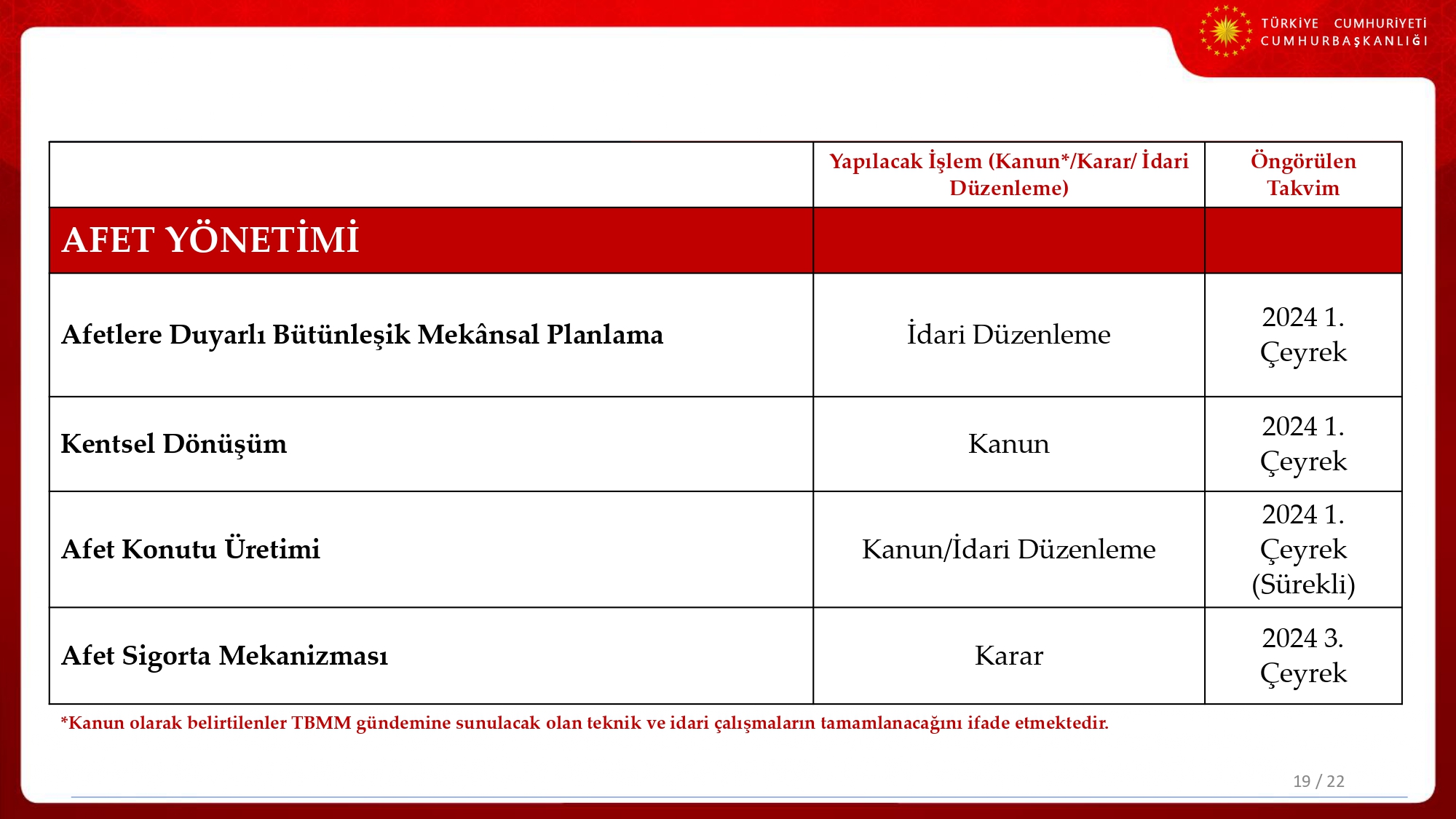 Planın temel çatısını bu slaytta özetlemeye çalıştık. Ana çatıyı bu şekilde ifade edebiliriz. 3 yıllık dönemde neyi gerçekleştireceğiz diye sorduklarında, deprem afetinin yaralarını saracağız. Geleceğe dönük afetlerle ilgili riskleri azaltıcı yatırımları hayata geçeceğiz.