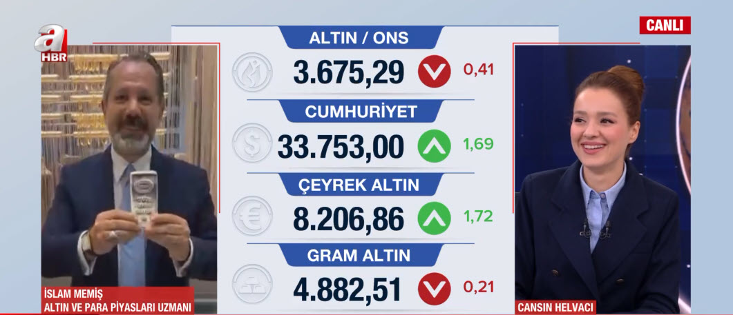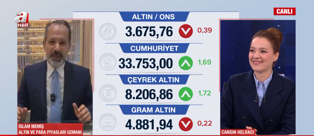 Herkes altını konuşuyor. Gram altının fiyatı 5 bin lirayı gördü. Bir yandan gözler de Amerikan Merkez Bankası'nın açıklayacağı faiz kararına çevrilmiş durumda. Altında yön ne olacak? Rekor üstüne rekor kıran altında yön ne? Gram altın 6 bin lirayı görür mü? Altın ve Para Piyasaları Uzmanı İslam Memiş, A Haber canlı yayınında Ajans Bugün programında Cansın Helvacı'nın sorularını yanıtladı.