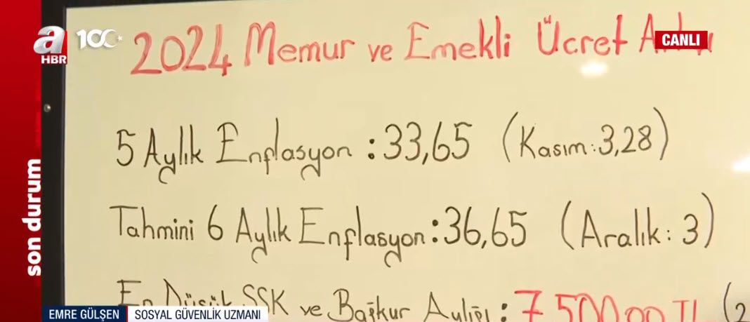 5 aylık enflasyon farkının belli olmasıyla birlikte, memur ve emekli maaşı zammının ne kadar olacağı merak konusu. Memur ve memur emeklisinin maaşı ne kadar olacak? SSK ve BAĞ-KUR emeklileri ne kadar zam alacak? Yeni asgari ücret kaç lira olacak? Sosyal Güvenlik Uzmanı Emre Gülşen, A Haber canlı yayınında konu ile ilgili değerlendirmelerde bulundu. İşte tahmini rakamlar...