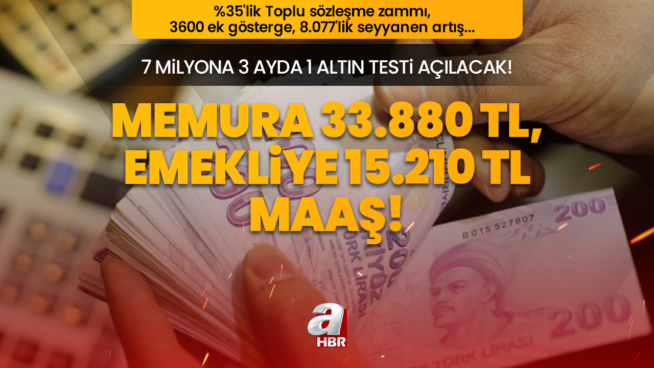 7 milyona 3 ayda 1 altın testi açılacak! Memura 33.880 TL, Emekliye 15.210 TL maaş! %35'lik Toplu sözleşme zammı, 3600 ek gösterge, 8.077'lik seyyanen artış...