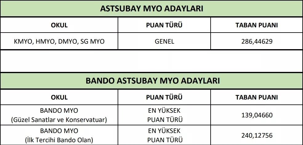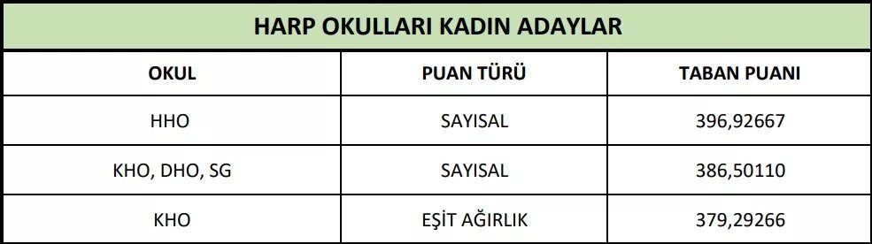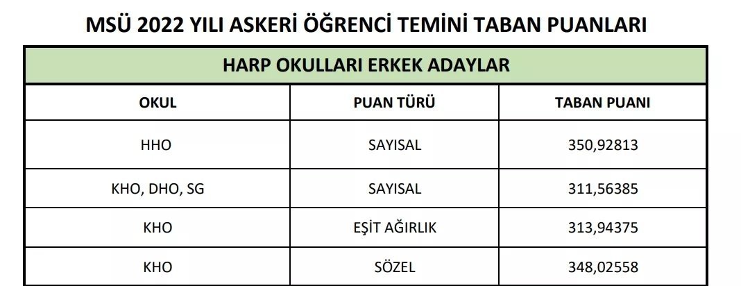 MSÜ sınavına giren adaylar ardından taban puanları hesaplamaya başladı. TSK bünyesinde istihdam edilmeyi hedefleyen adaylar alacakları puanları öğrenmeye çalışıyor. MSÜ sınavında her sınavda olduğu gibi 4 yanlış 1 doğruyu götürüyor. Her adayın, testlere verdiği doğru ve yanlış cevapların sayısı bu kural doğrultusunda yapılacak. İşte Kara, Hava, Deniz Harp Okulu taban puanları...