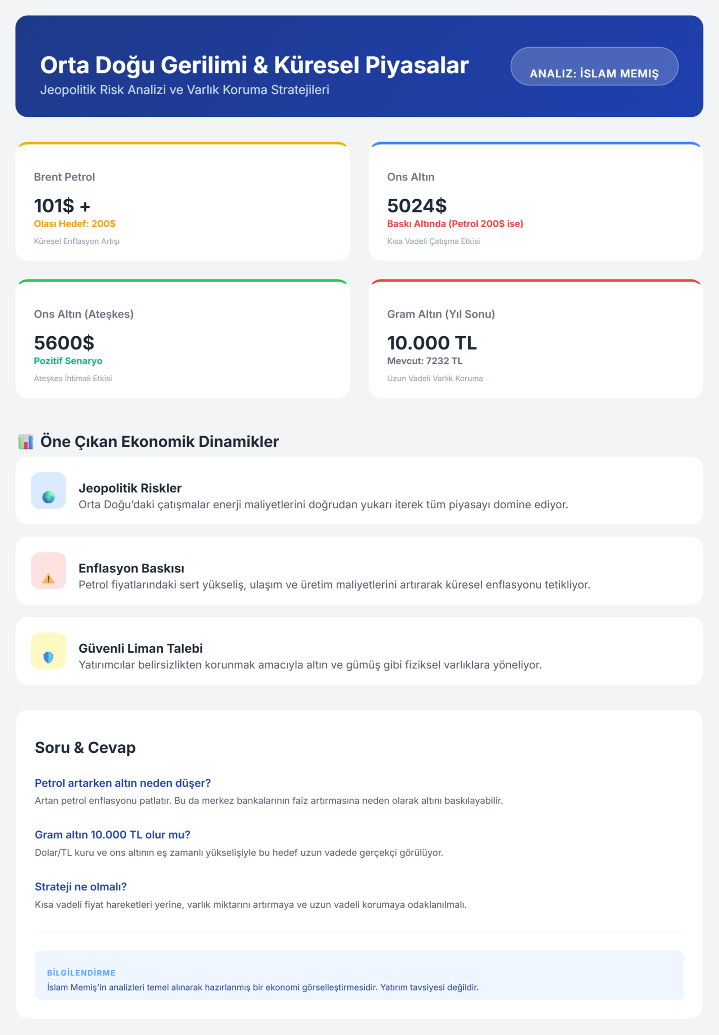 Orta Doğu'daki savaşın ikinci haftasında küresel piyasalar alarm veriyor. Petrol fiyatlarının 101 doların üzerine çıkması enflasyon endişelerini artırırken yatırımcılar güvenli liman olan altına yöneliyor. Finans Analisti İslam Memiş, savaş ve ateşkes senaryolarına göre ons altında sert hareketler görülebileceğini belirtirken gram altın için 10 bin lira hedefinin korunmaya devam ettiğini söyledi. Ayrıca 2024'ün para kazanma değil, varlığı koruma yılı olacağını vurguladı.