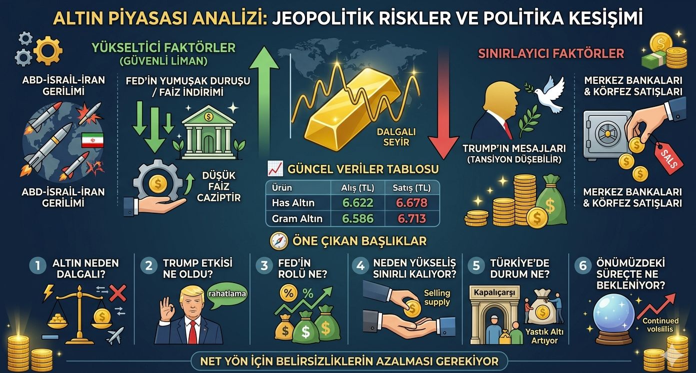 Altın piyasasında jeopolitik gerilimlerin etkisi sürüyor. ABD, İsrail ve İran hattındaki gelişmelerin 32. gününde fiyatlar dalgalı seyrini korurken, Donald Trump'ın açıklamaları ve FED sinyalleri yön belirliyor. Kapalıçarşı'da ay sonu sakinliği yaşanırken, uzmanlar belirsizlik ortamında altının "güvenli liman" özelliğine rağmen satış baskısının arttığına dikkat çekiyor.