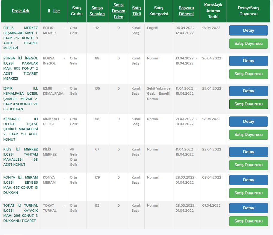 Toplu Konut İdaresi (TOKİ) tarafından uygun fiyatlı daire ve arsa satışları için duyurular gelmeye devam ediyor. Kurum tarafından yapılan son açıklamaya göre 7 ilde satışlar sürüyor. Bitlis, Bursa, İzmir, Kırıkkale, Kilis, Konya, Tokat'ında içinde bulunduğu illerde uygun fiyatlı dairelerin satış ve taksit fiyatları paylaşıldı. Öte yandan, 28 ilde 472 konut ve ticari arsa makul fiyatlarla satışa çıkıyor. Açık arttırma ile yapılacak satışlar 5, 6 ve 7 Nisan'da yapılacak. İşte, TOKİ 7 ilde uygun fiyatlı daire satışları...