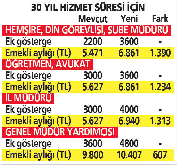 30 yıl hizmeti olan öğretmen ve avukatlara 5 bin 627 lira yerine 6 bin 681 lira emekli aylığı ödenecek.