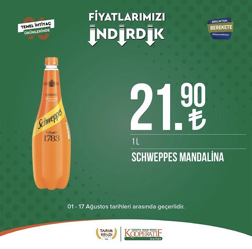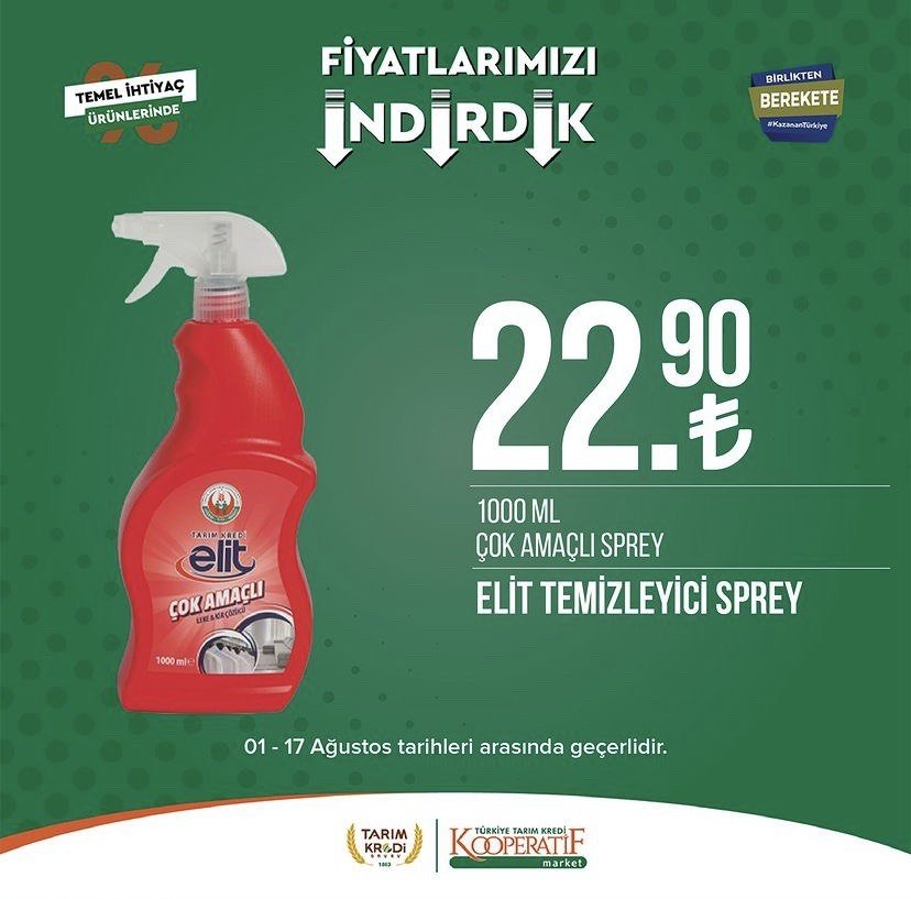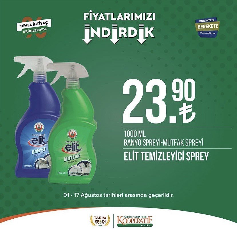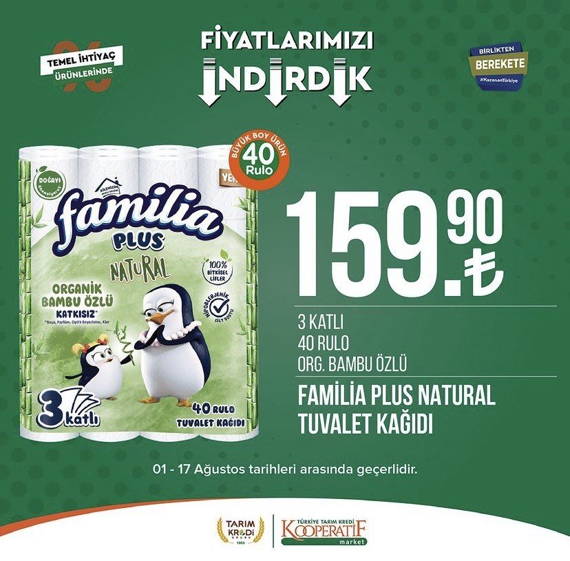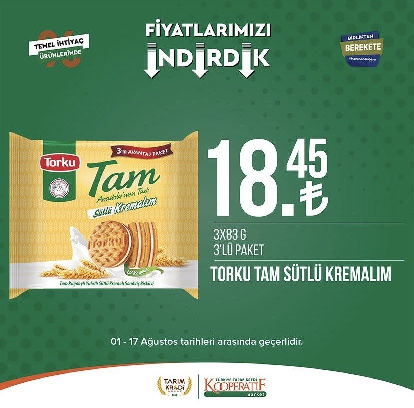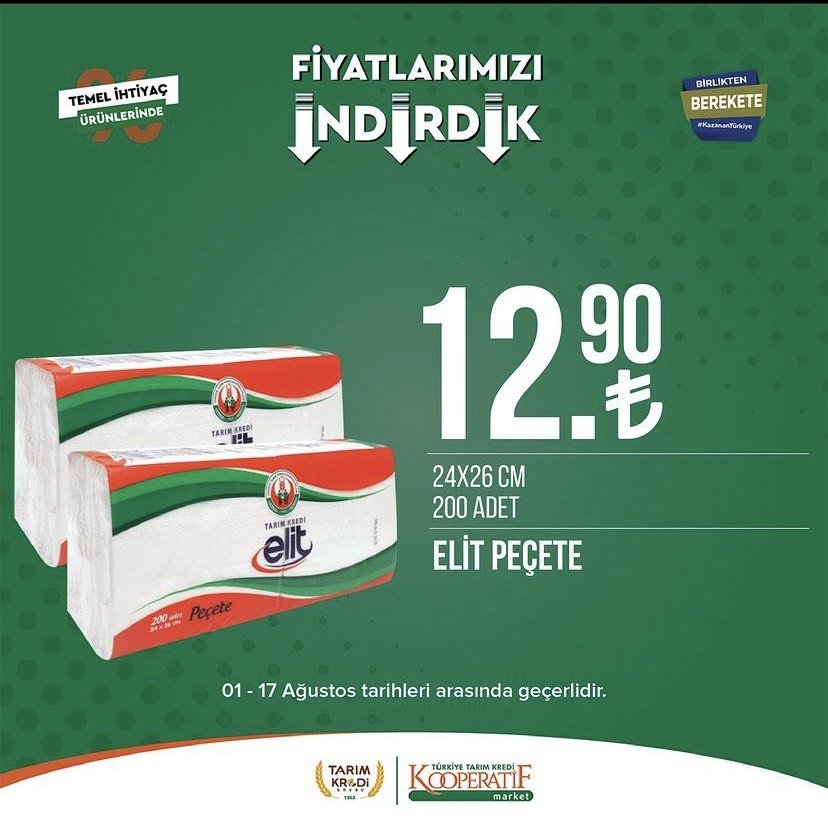 Tarım Kredi Kooperatif Marketleri, 1-17 Ağustos tarihleri arasında geçerli olacak yeni kataloğunu açıkladı. Türkiye'nin birçok bölgesinde hızla yayılan ve uygun fiyatlı alışveriş imkanı sunan Tarım Kredi Kooperatifi marketlerine olan ilgi her geçen gün artarak devam ediyor. Ağustos ayı itibarıyla başlayan kampanyalar, birbirinden çeşitli ürünleri müşterilerle buluşturuyor. Zeytinden pirzolaya, beyaz peynirden sucuğa, şampuanlardan tuvalet kağıdına kadar onlarca farklı çeşit ürün bu hafta satışa sunulacak.