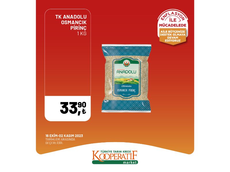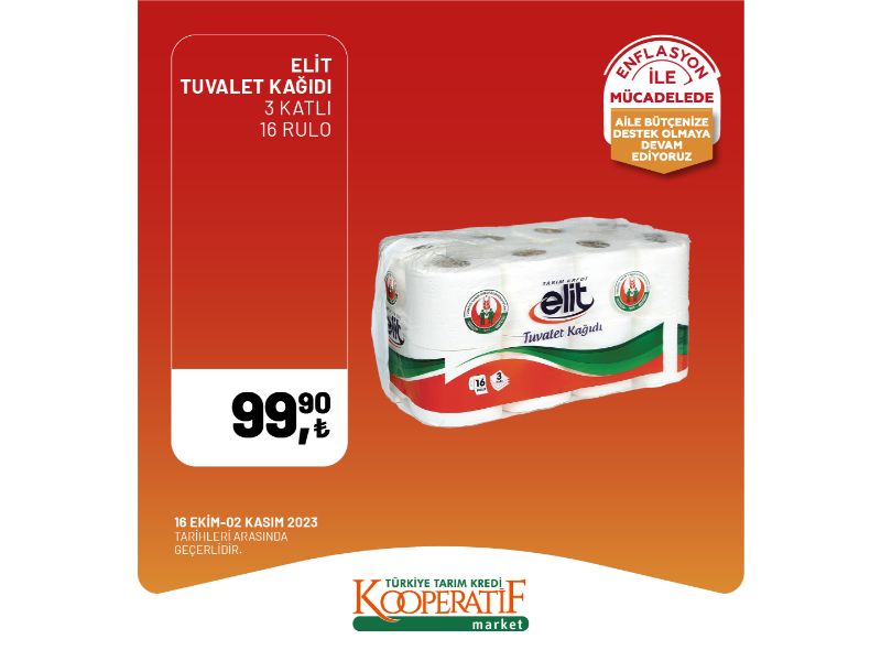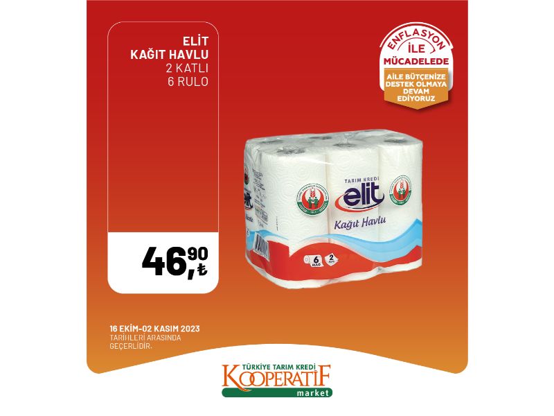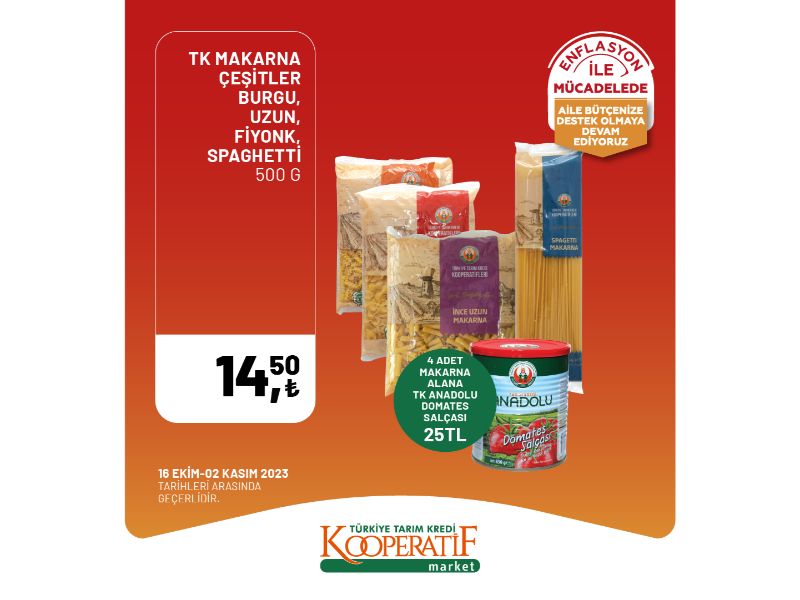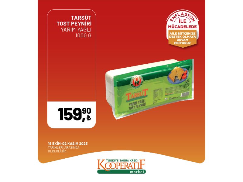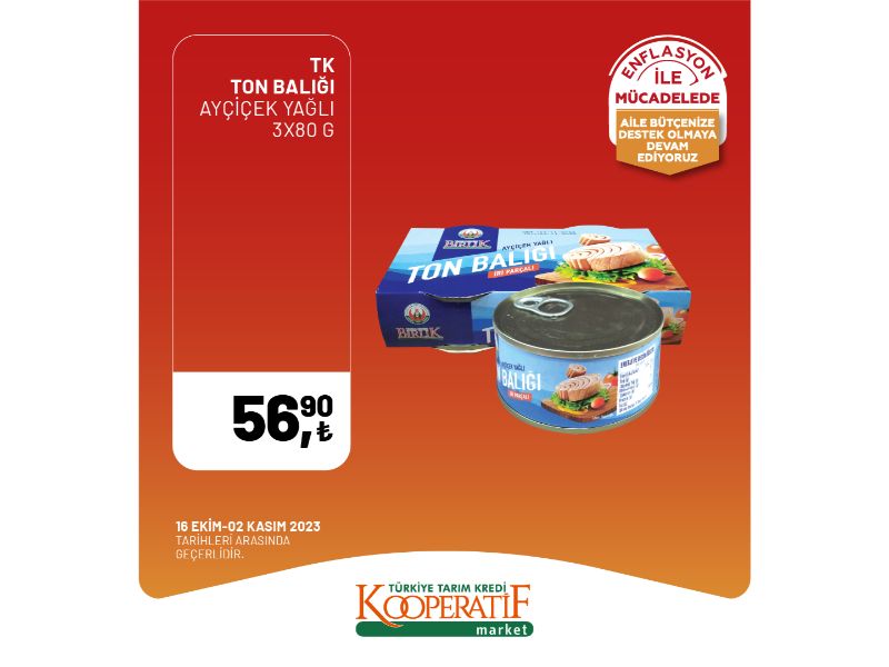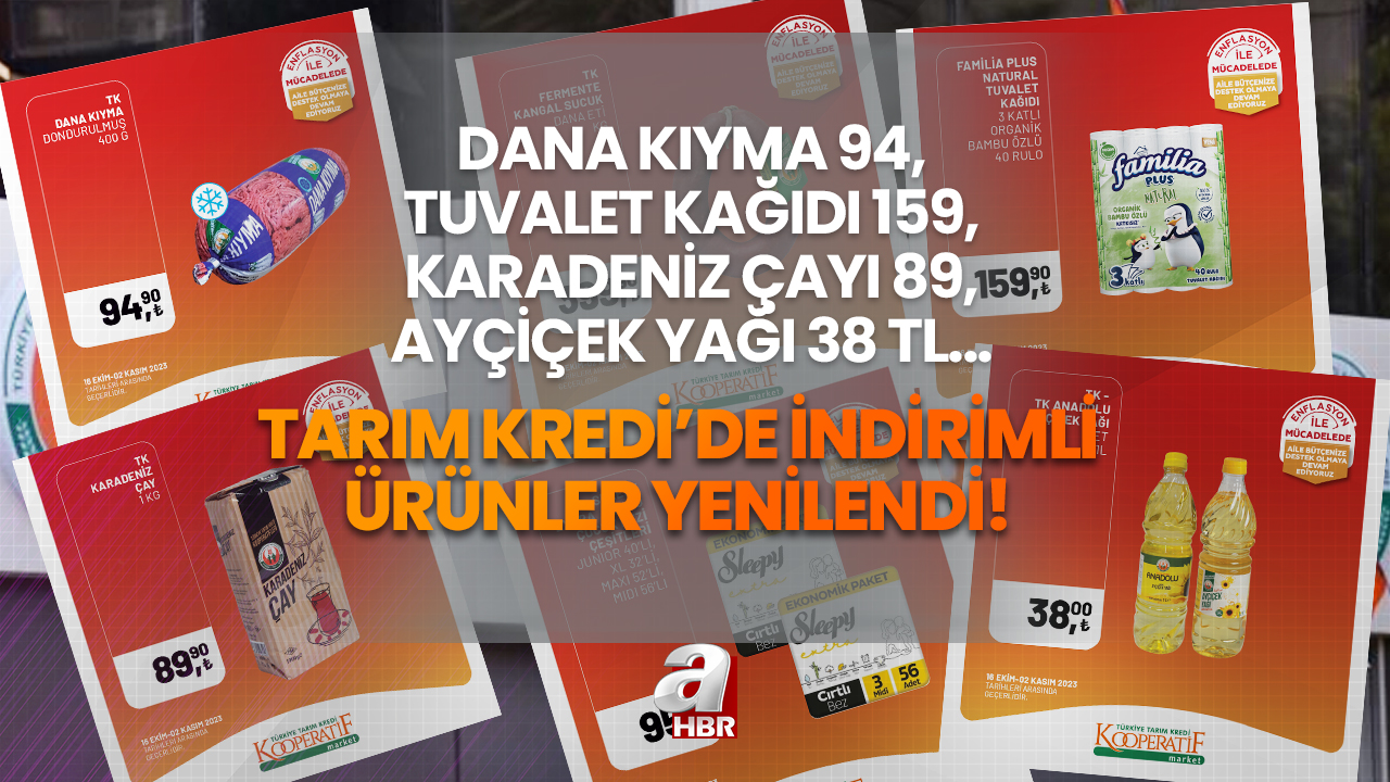 Tarım Kredi Market enflasyonla mücadele kapsamında indirimli ürünler kataloğunu sil baştan yeniledi. 2 Kasım 2023 tarihine kadar sürecek olan indirimli ürünler listesinde; Kuru Soğan 5,90 TL, Limon 11,75 TL, Salatalık 12,50 TL, Elma 19,90 TL, Yerli Muz 29,90 TL, kıyma 400 gr 34,90 TL'den, çamaşır deterjanı 115,90 TL'den, 40'lı tuvalet kağıdı 159,90 TL'den, bütün tavuk 56,90 TL'den, çay 89,90 TL'den, 5lt su 11,90 TL, kaşar peynir 159,90 TL'den yer alıyor. İşte TK özel indirim kampanyası ve fiyatları...