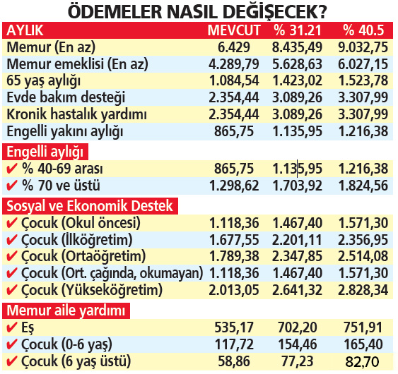 Memur ve emekli derken her kesimi ilgilendiren temmuz zammında son viraja girildi. Şu ana kadar memur ve memur emeklisine yüzde 40.5 zam ortaya çıkarken, yaşlıdan engelliye, yakınına bakandan hasta ve çocuklara kadar milyonların gelirine yansıyacak maaş artışı gündemdeki yerini koruyor. 2022 Temmuz zammı ile ilgili son gelişmeleri yazımızda ele aldık. Peki, en düşük emekli ve memur maaşı ne kadar olacak? 65 yaş aylığı, engelli maaşı, engelli aylığı, hasta deteği ne kadar artacak? İşte cevaplar...