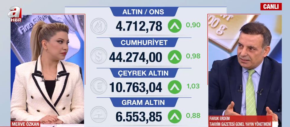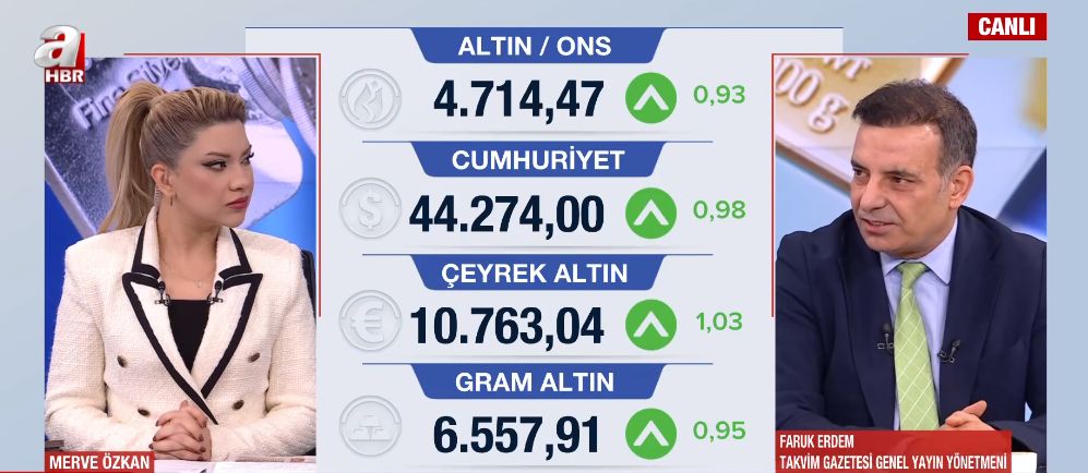 Haber moderatörü Merve Özkan'ın, "Kısa süre sonra 7 bini görecek gibiyiz" yorumu üzerine Faruk Erdem, "Öyle gözüküyor, ilk çeyrekte bu hızla giderse 7 bin lira bandını görebiliriz. Gümüşte de benzer bir tablo var, 130 lirayı geçmiş durumda ve 200 lirayı görebileceği konuşuluyor" dedi. Yatırımcıları kâr satışları konusunda da uyaran Erdem, "Alım satım arasında ciddi bir makas var, yatırımcının çok dikkatli olması lazım. Her alınan ürün kazandırabilir ama kısa vadeli hareketlerde dikkatli olunmalı" ifadelerini kullandı.