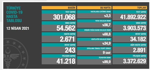 Toplam test sayısı 41 milyon 591 bin 854'e ulaştı, vaka sayısı 3 milyon 849 bin 11, vefat sayısı 33 bin 939, ağır hasta sayısı 2 bin 824 oldu.