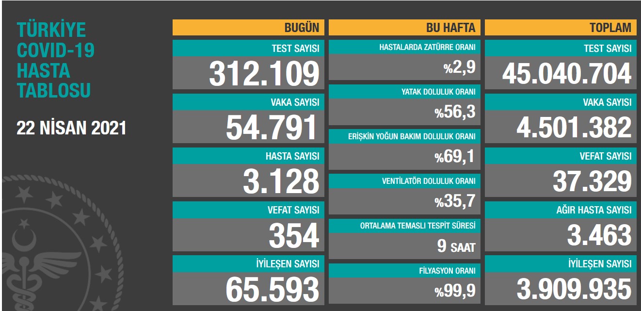 22 Nisan Perşembe günkü tabloya göre, son 24 saatte 312 bin 109 Kovid-19 testi yapıldı, 54 bin 791 kişinin Kovid-19 testi pozitif çıktı, 354 kişi yaşamını yitirdi, hasta sayısı 3 bin 128 oldu.