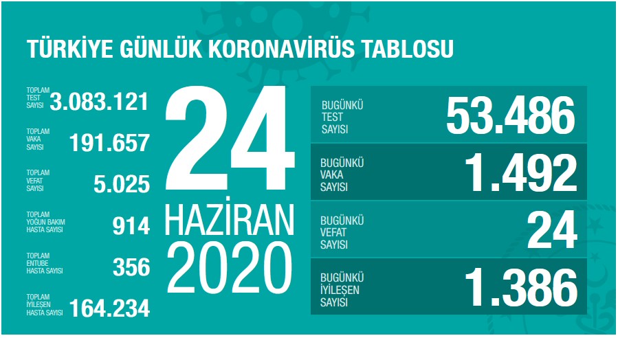 Türkiye'de 24 Haziran 2020 tarihi itibarıyla toplam vaka sayısı 191.657 oldu. Koronavirüs nedeniyle 5.025 kişi hayatını kaybetti. Toplum yoğun bakım hasta sayısı 914, toplam entube hasta sayısı 356 olarak açıklanırken, 164.234 hastanın iyileştiği bildirildi.