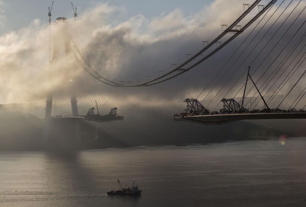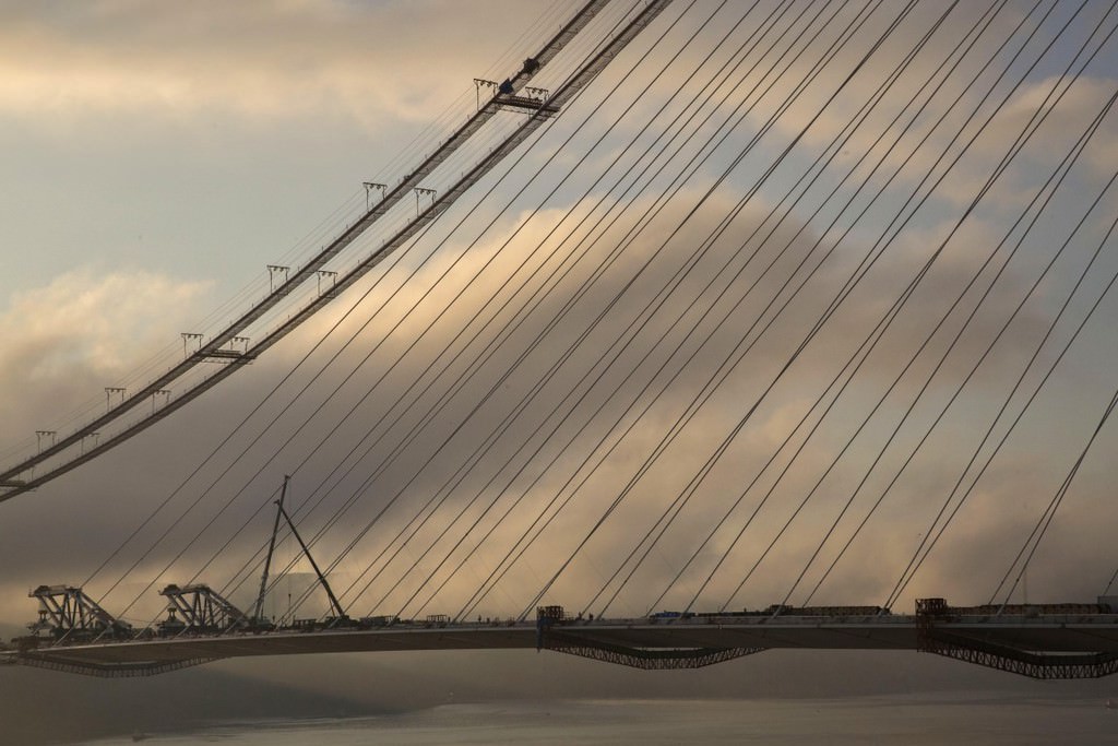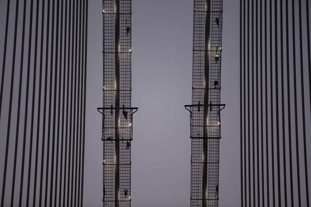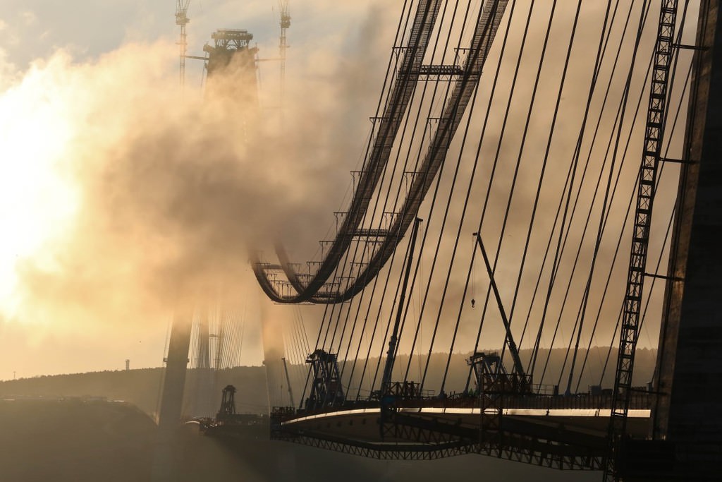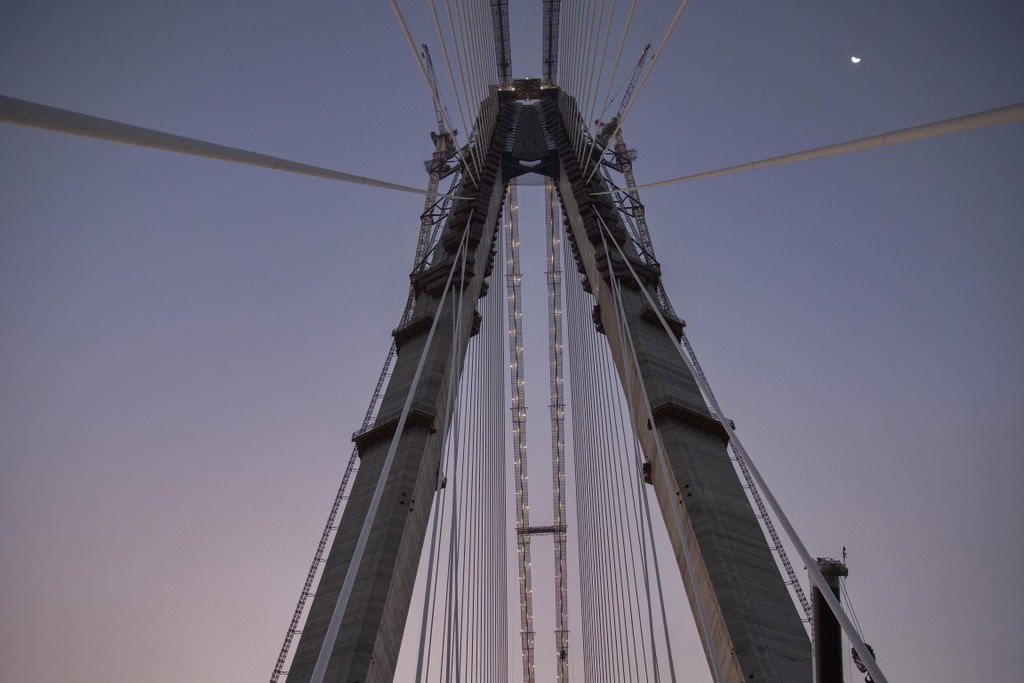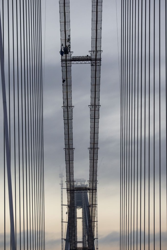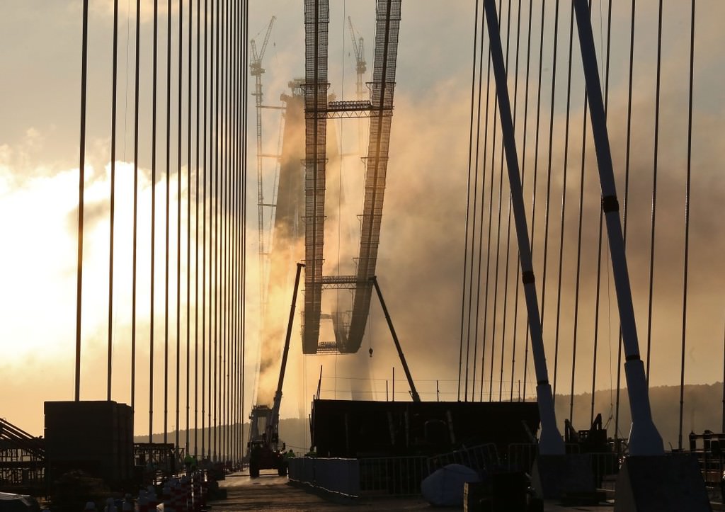 Her iki yakadaki kulelerde deniz seviyesinden 304,5 metre yükseklikte betonarme imalatlar tamamlandı, geçici iskelelerin söküm işleri de devam ediyor.