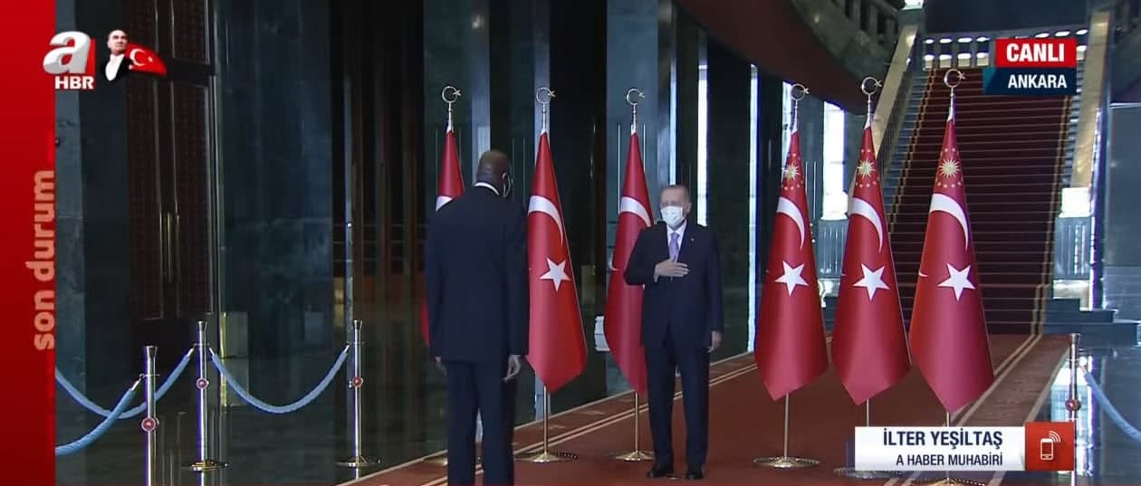 Erdoğan, Atatürk'ün mozolesine ay yıldız motifli çelengi bıraktı. Saygı duruşunun ardından İstiklal Marşı okundu.