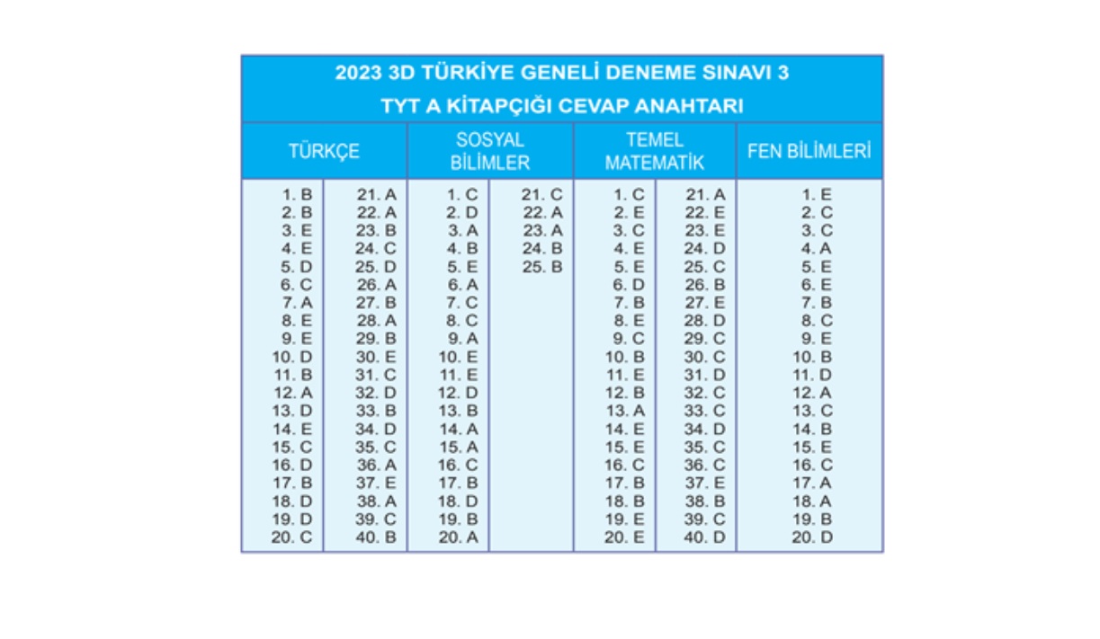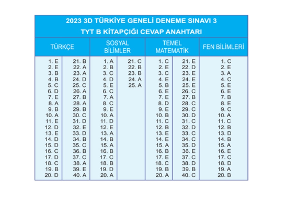 3D yayınları tarafından gerçekleştirilen Türkiye geneli sınavın A ve B kitapçığının cevapları şu şekilde:
