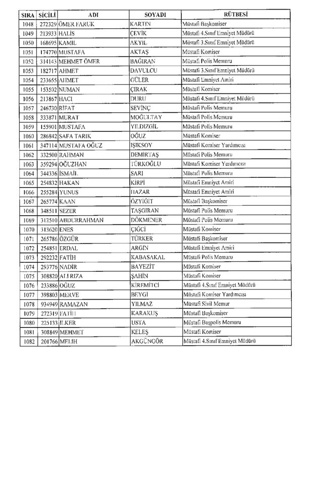 675 sayılı KHK ile resen emekli edilen, meslekten ihraç edilen ve kendi isteğiyle meslekten ayrılan bin 82 emniyet teşkilatı mensubunun rütbesi alındı. İşte, rütbesi alınan emniyet teşkilatı mensuplarının isim isim tam listesi...