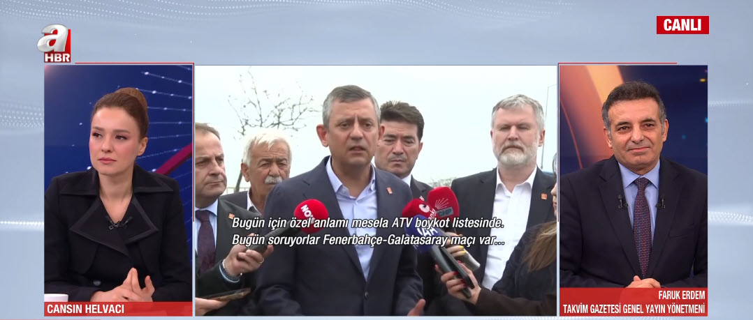 Türkiye CHP'nin boykotunu boykot etti. Halk CHP Genel Başkanı Özgür Özel'in çağrısına tepki gösterdi. A Haber spikeri Cansın Helvacı canlı yayında A Haber ve ATV'yi de hedef alan Özgür Özel'e seslendi. Helvacı, "Biz alışkınız daha önce boynumuza urgan geçireceklerdi, FETÖ listelerinde isimlerimiz vardı ama bunun vebali ya da bundan sonraki karışıklığı nasıl önleyecekler?" dedi. İşte Helvacı'nın Özgür Özel'e yönelttiği sorular...