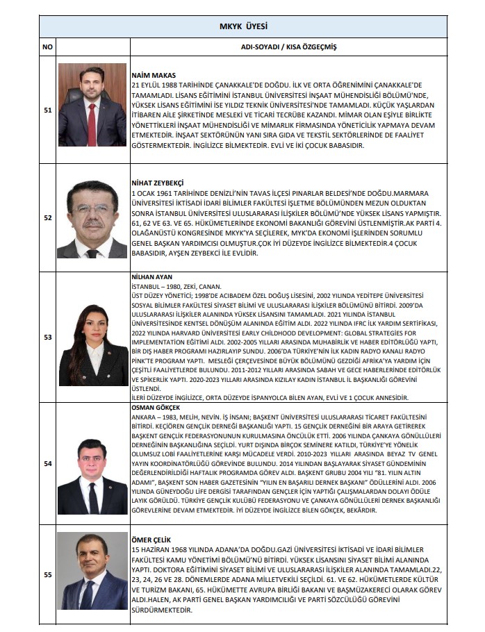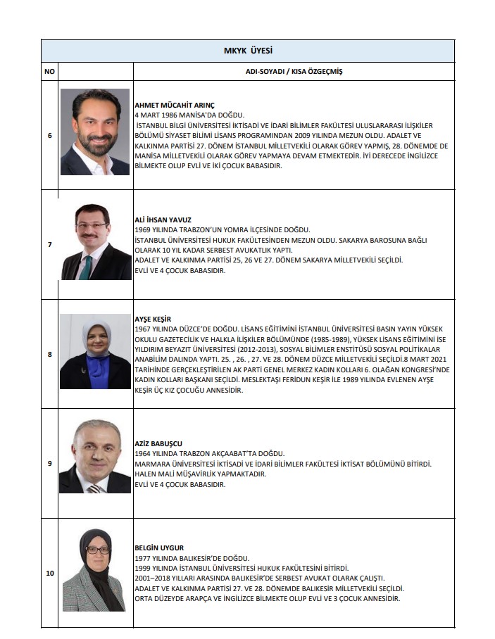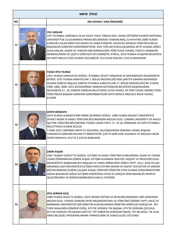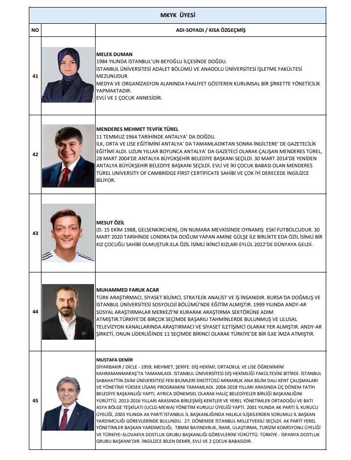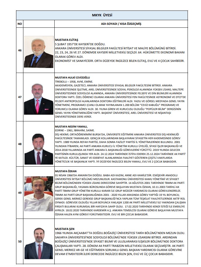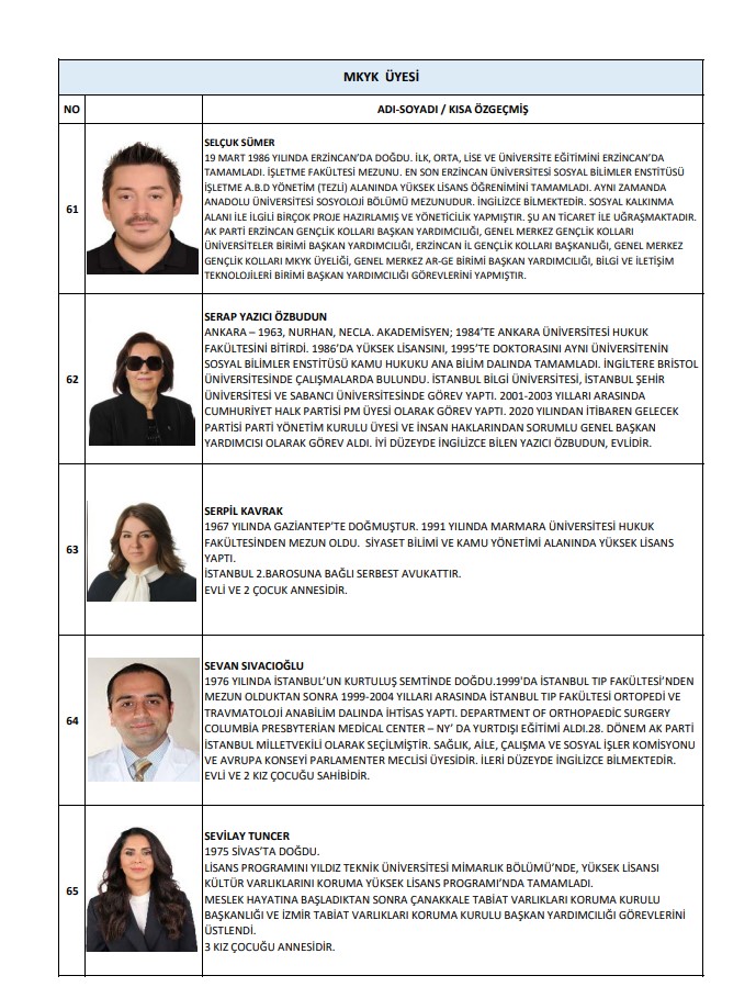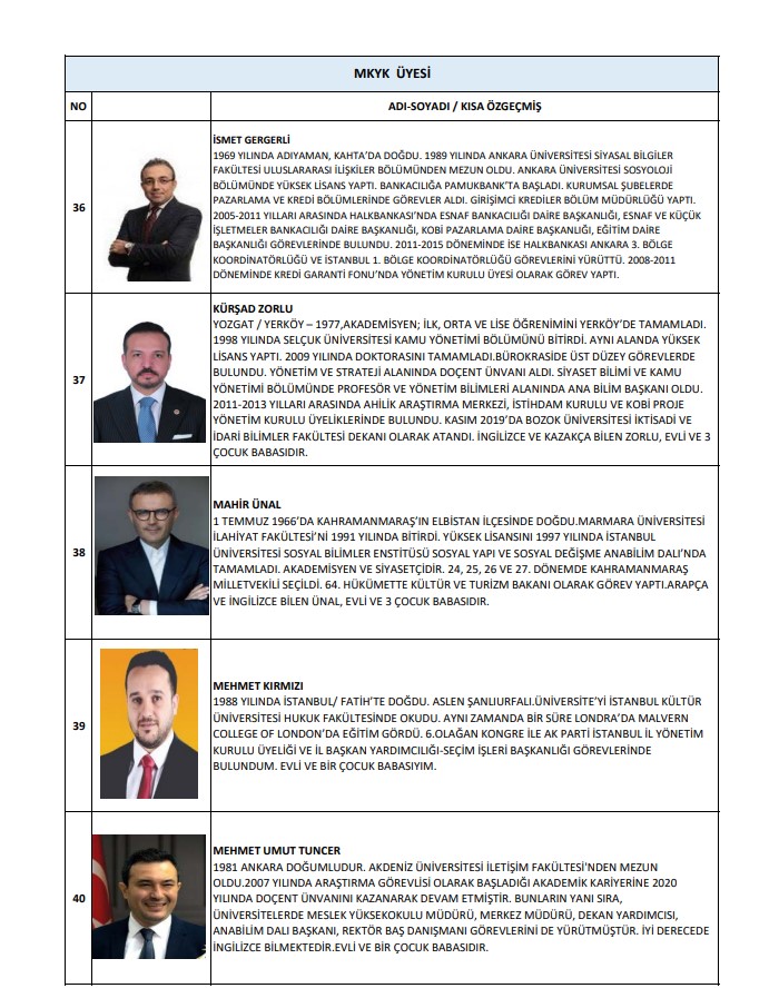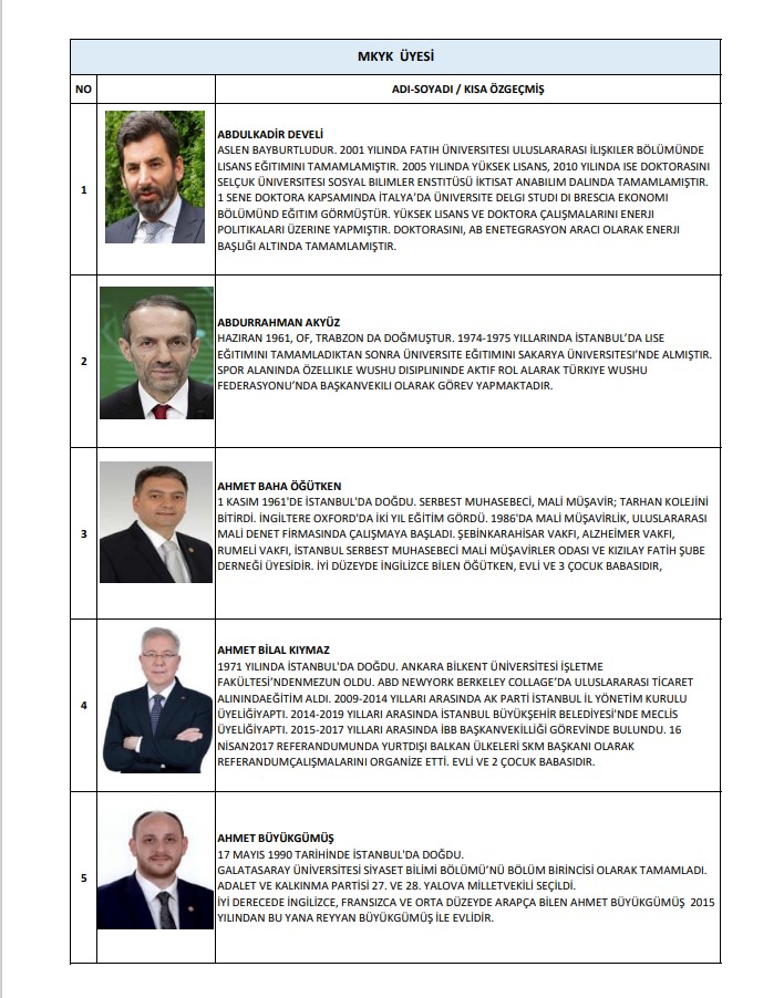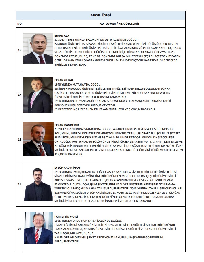Buna göre MKYK listesinde; Abdulkadir Develi, Abdurrahman Akyüz, Ahmet Baha Öğütken, Ahmet Bal Kıymaz, Ahmet Büyükgümüş, Ahmet Mücahit Arınç, Ali İhsan Yavuz, Ayşe Keşir, Aziz Babuşçu, Belgin Uygur, Cengiz Tokmak, Çiğdem Karaaslan, Derya Ayaydın, Dursun Ataş, Efkan Ala, Erkan Kandemir, Eyüp Kadri İnan, Fahrettin Yahşi, Fatih Sadullah Selman, Fatih Şahin, Fatma Betül Sayan Kaya, Fadime Zehra Şener, Gökhan Diktaş, Halit Yerebakan, Hamza Dağ, Hasan Basri Yalçın, Hayati Yazıcı, Haydar Ali Yıldız, Hilal Kalyoncu Koç, Hilmi Türkmen, Hülya Terzioğlu, Hüseyin Yayman, İdris Nebi Hatipoğlu, İsmet Gergerli, Kürşad Zorlu, Mahir Ünal, Mehmet Kırmızı, Mehmet Umut Tuncer, Melek Duman, Menderes Mehmet Tevfik Türel, Mesut Özil, Muhammed Faruk Acar, Mustafa Demir, Mustafa Elitaş, Mustafa Hulki Cevizoğlu, Mustafa Nedim Yamalı, Mustafa Özkan, Mustafa Şen, Naim Makas, Nihat Zeybekçi, Nilhan Ayan, Osman Gökçek, Ömer Çelik, Ömer Faruk Besli, Ömer İleri, Ömer Serdar, Önder Matlı, Sadettin Hülagü, Selçuk Sümer, Serap Yazıcı Özbudun, Serpil Kavrak, Sevan Sıvacıoğlu, Sevilay Tuncer, Seyithan İzsiz, Temel Başalan, Türk İslam Karakoç, Umut Arman Sonay, Ünal Karaman, Veli Arslan, Yusuf Ziya Yılmaz, Zafer Sırakaya, Zakir Avşar, Ziya Serdar Kılıç yer aldı.
