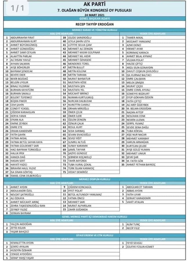 AK Parti 7. Olağan Büyük Kongresi oy pusulası belli oldu. İşte AK Parti MKYK üye adayları: