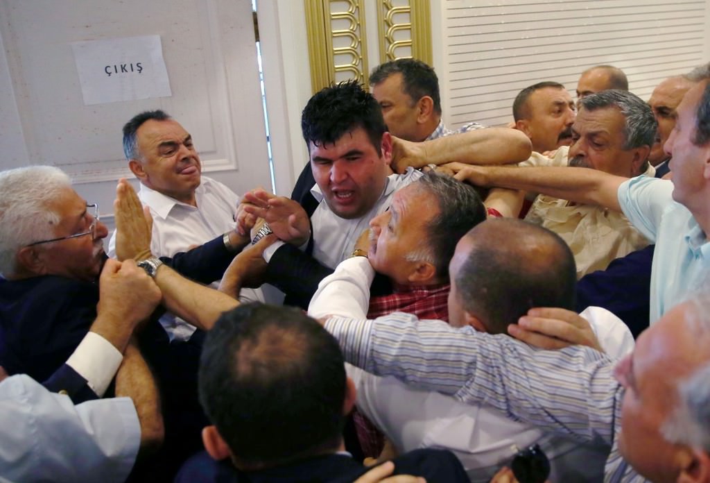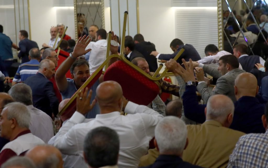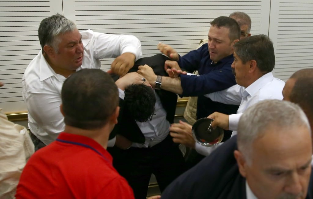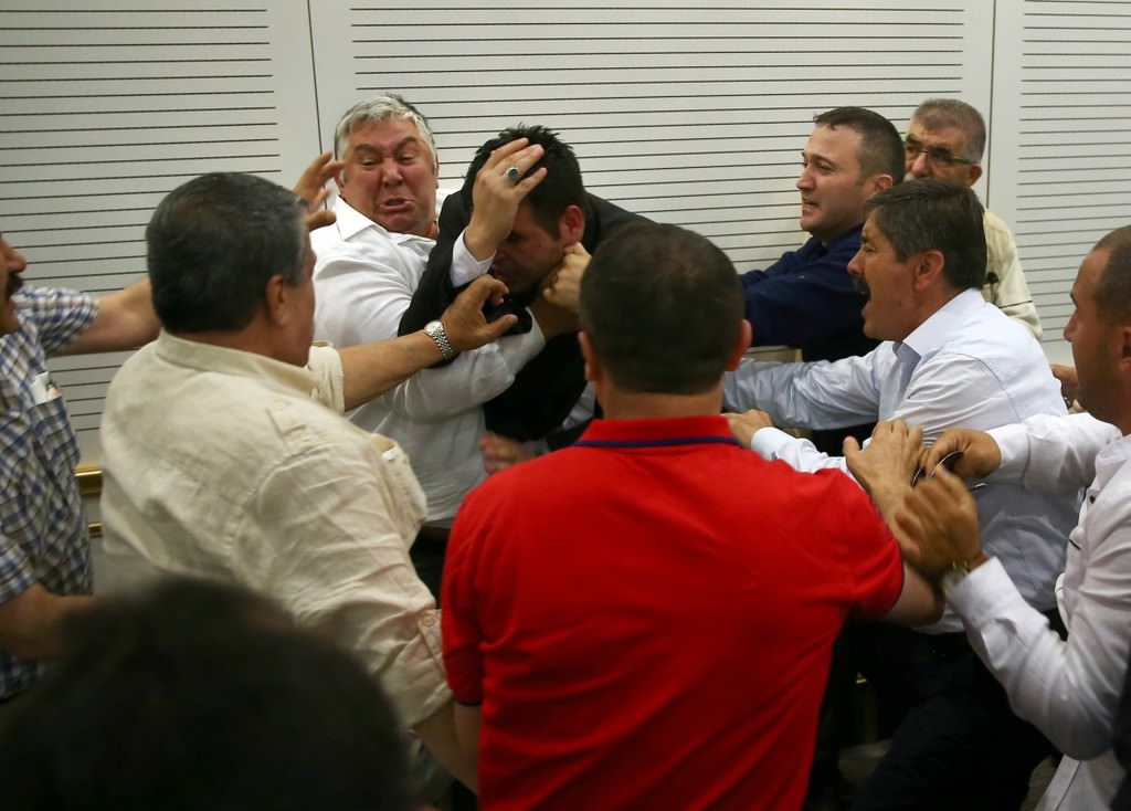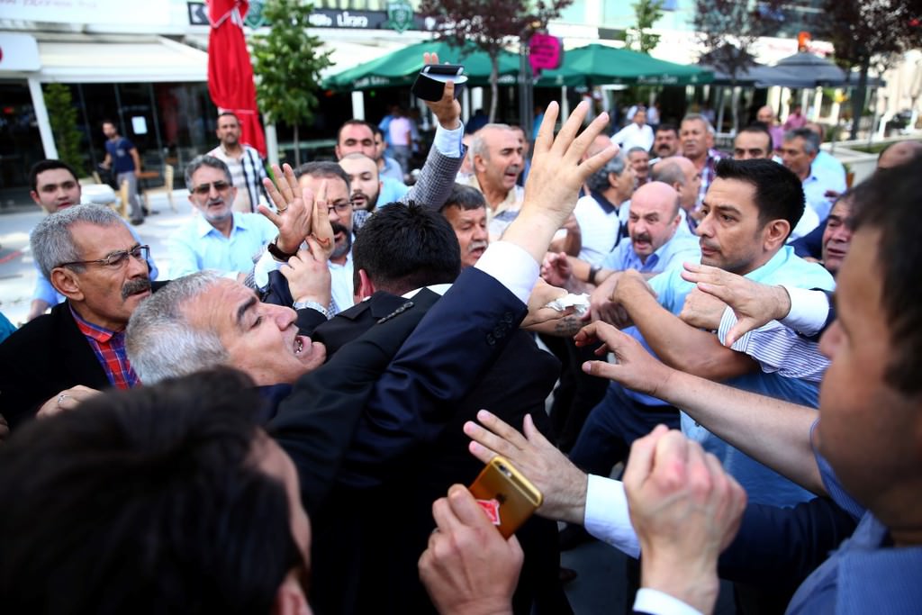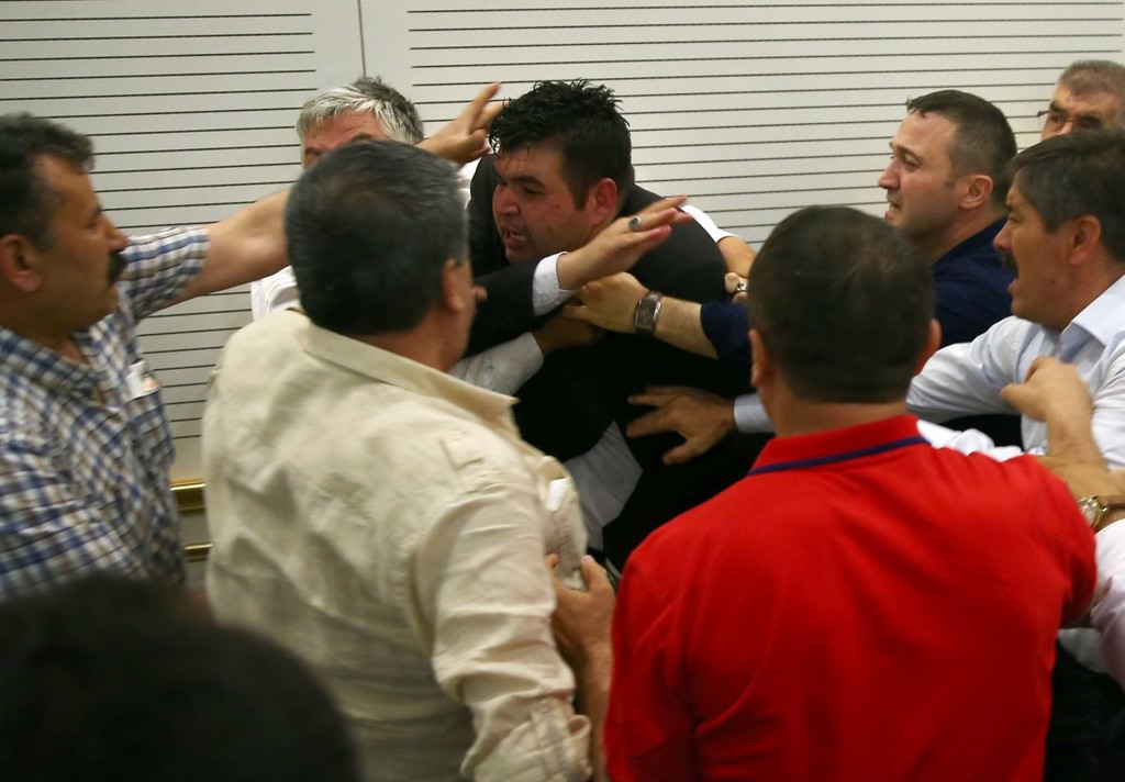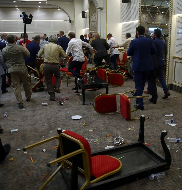 Bunun üzerine protestocu gruba, bardak ve sandalye fırlatıldı. Olayın kavgayadönüşmesi üzerine protestocu grup salondaki muhaliflerce dışarı çıkarıldı.