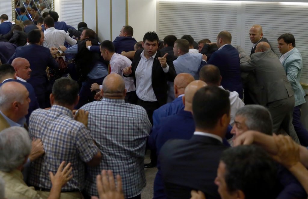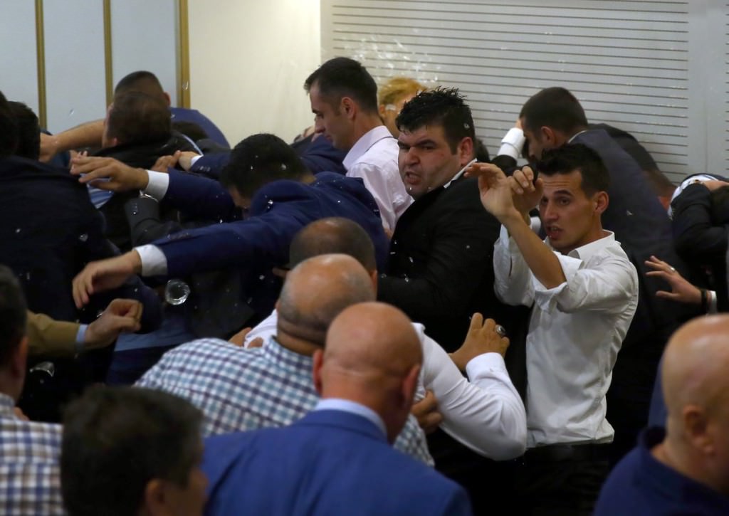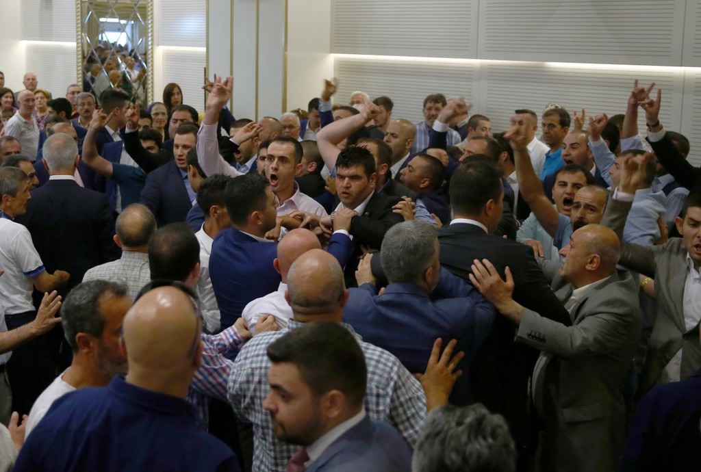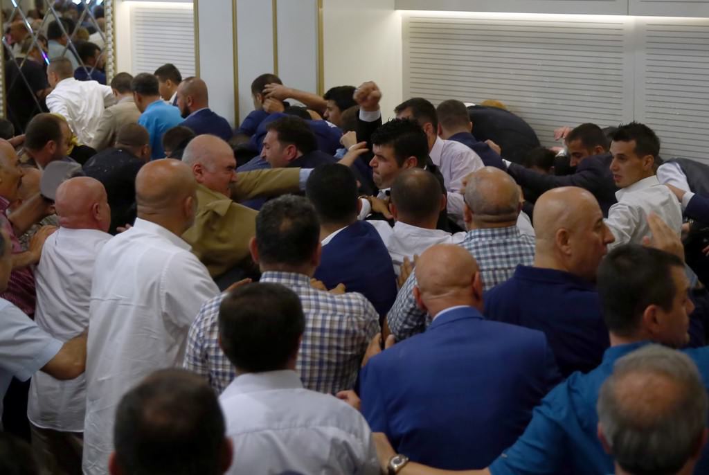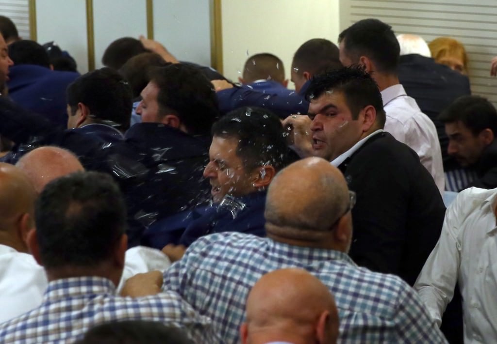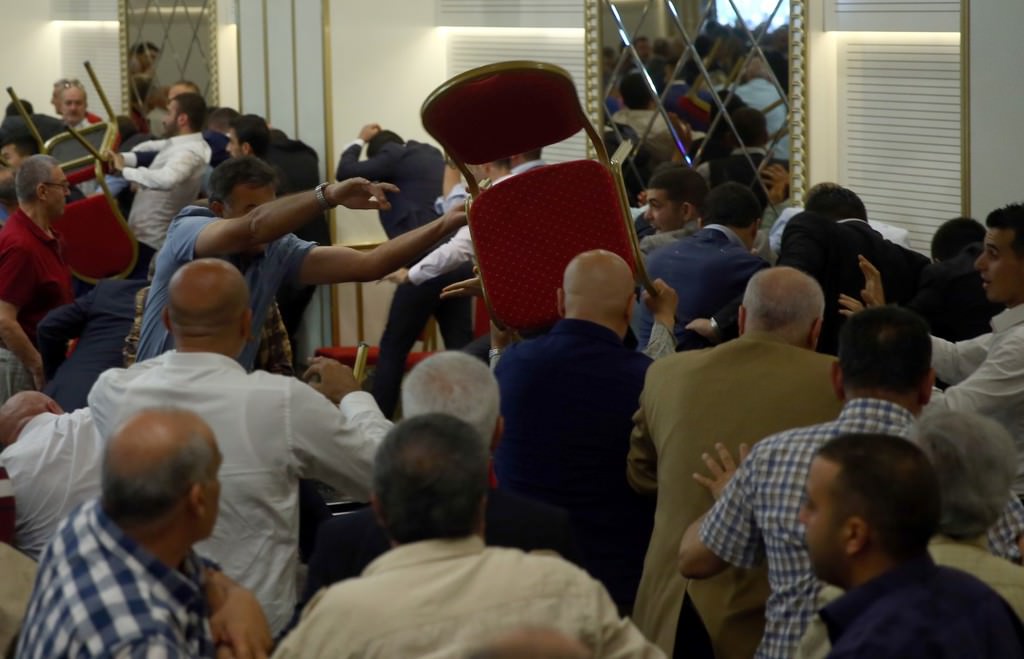 Bunun üzerine protestocu gruba, bardak ve sandalye fırlatıldı. Olayın kavgayadönüşmesi üzerine protestocu grup salondaki muhaliflerce dışarı çıkarıldı.