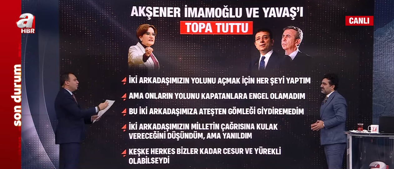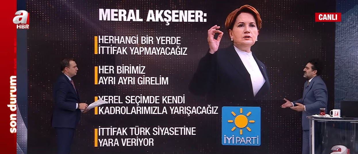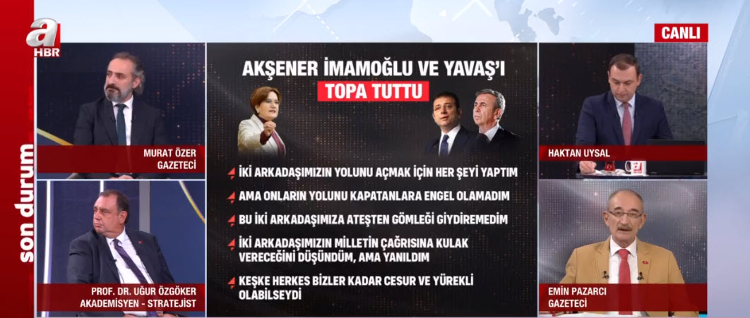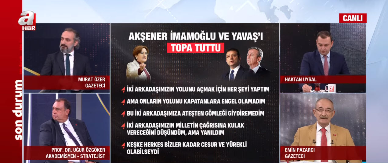 Muhalefetteki çatlak yerel seçim öncesi derinleşiyor mu? Meral Akşener, İmamoğlu-Yavaş'a küstü mü? İYİ Parti'den artık yalnızsınız mesajı mı geldi? Gazeteci Gaffar Okanca, Akşam Gazetesi Ankara Temsilcisi Emin Pazarcı ve kademisyen – Stratejist Prof. Dr. Uğur Özgöker, A Haber canlı yayınında gündemin öne çıkan başlıklarıyla ilgili çarpıcı değerlendirmelerde bulundu.